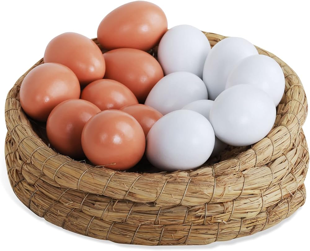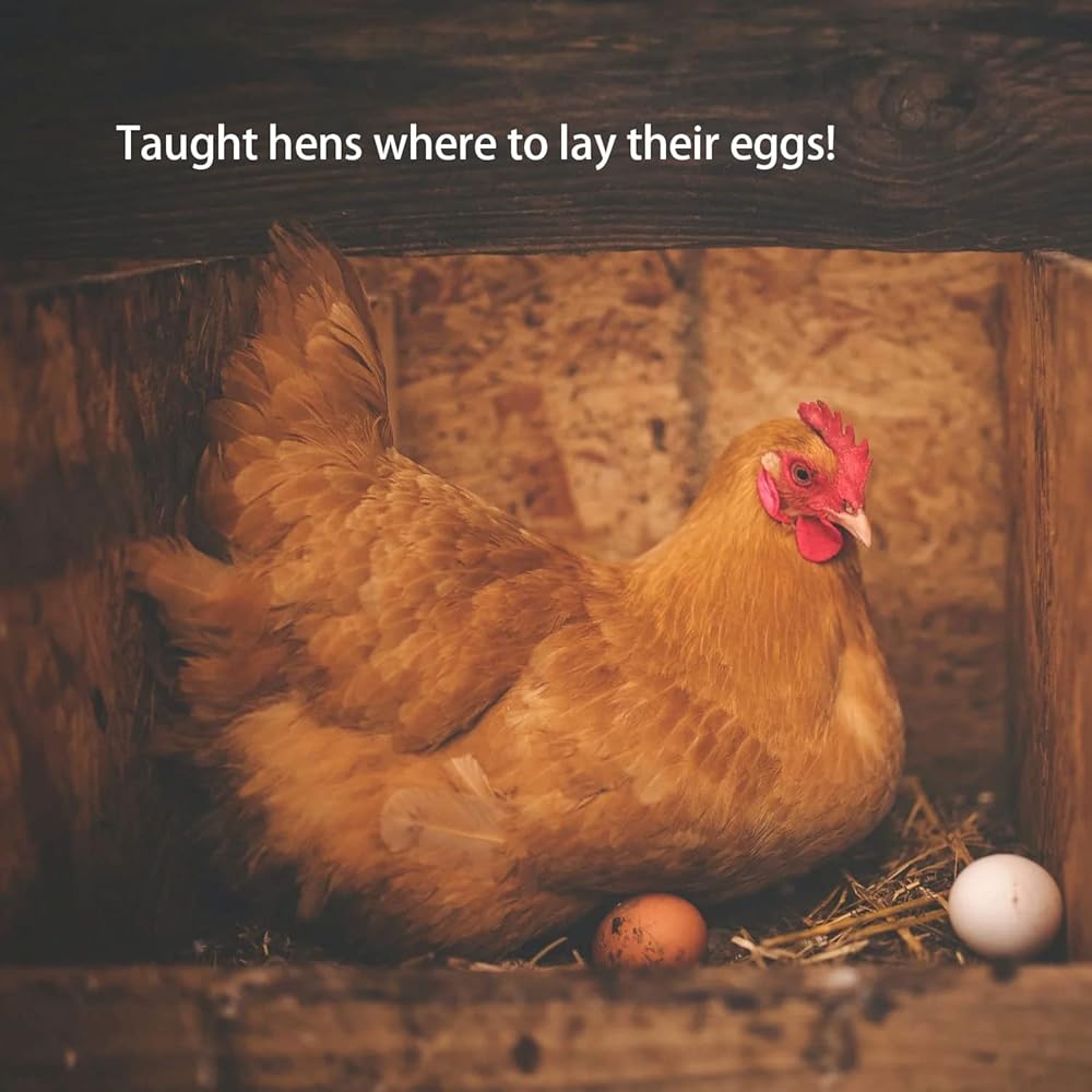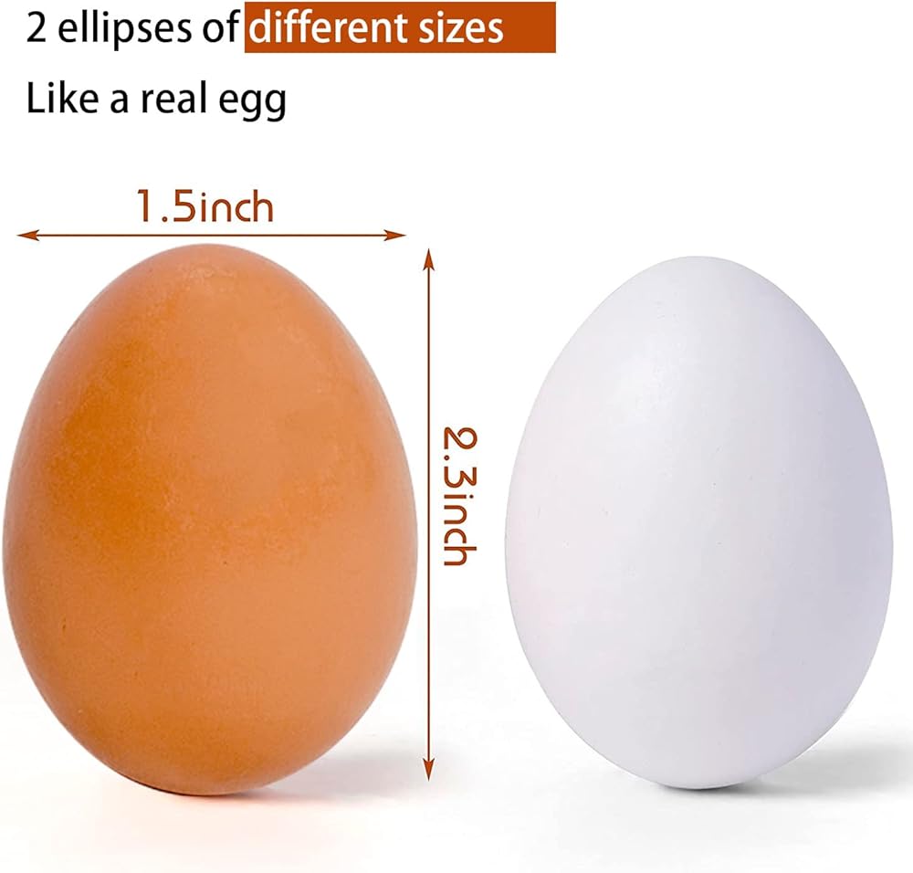 2.3inch x 1.5inch. It looks like real eggs.You can put into the chicken coop to promote the hen to lay eggs.