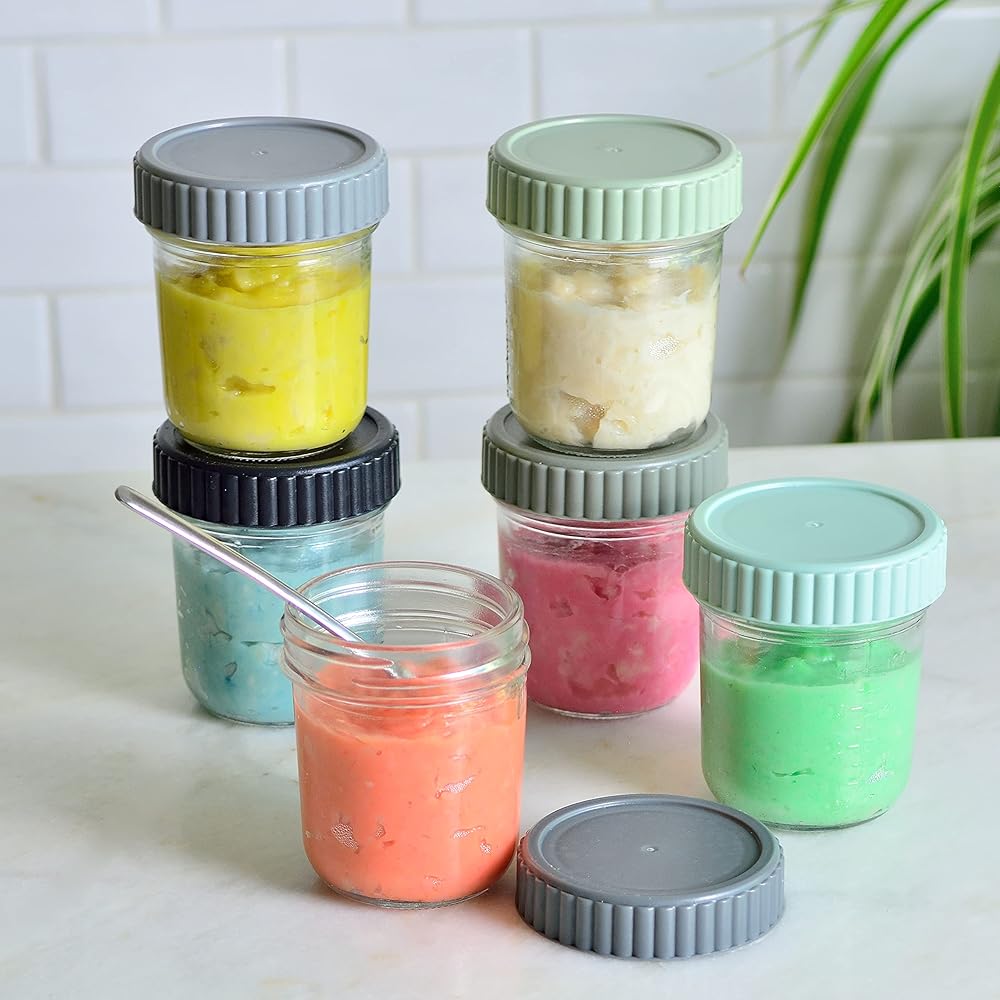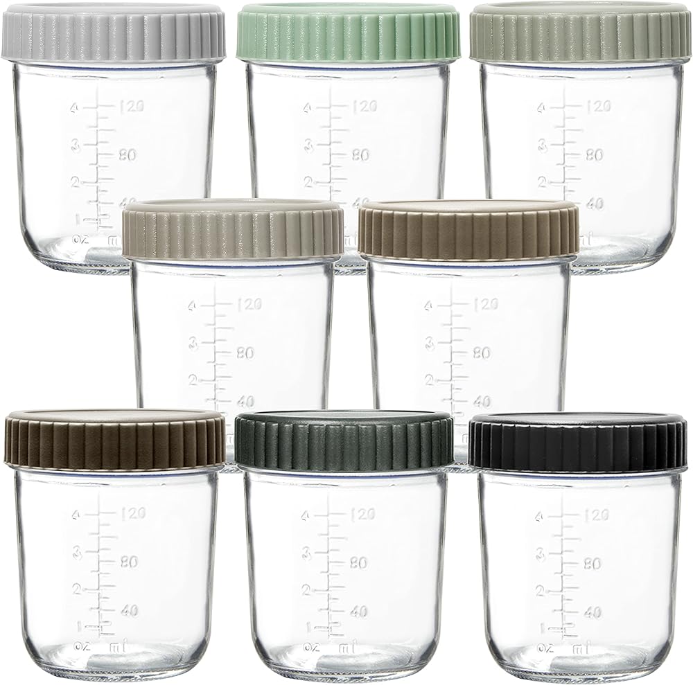 تخزين طعام الأطفال الزجاجي - 8 عبوات زجاجية لأغذية الأطفال (6 أونصة) مع أغطية ملونة حضرية.