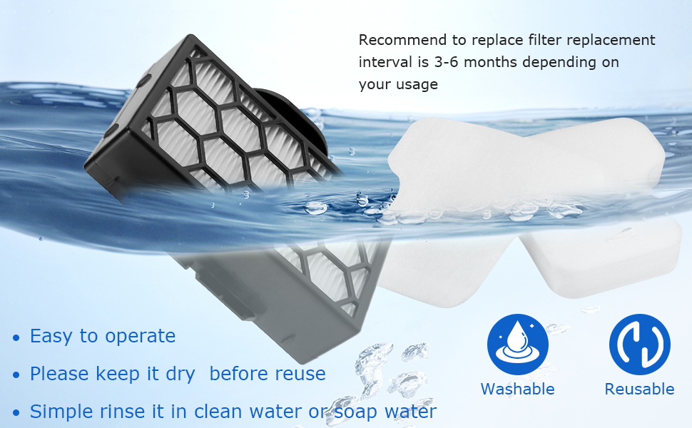 • 【WASHABLE & REUSABLE】Filter can be cleaned under running water using a small brush. Cleaning the filter will ensure the suction power of the vacuum cleaner, maintain its performance and prolong its life. The filter is reusable, but it must be allowed to dry naturally before being used again. If the filter is damaged, or if too much dust has accumulated, making it difficult to clean, please replace the filter in good time. The recommended filter replacement interval is 3-6 months.