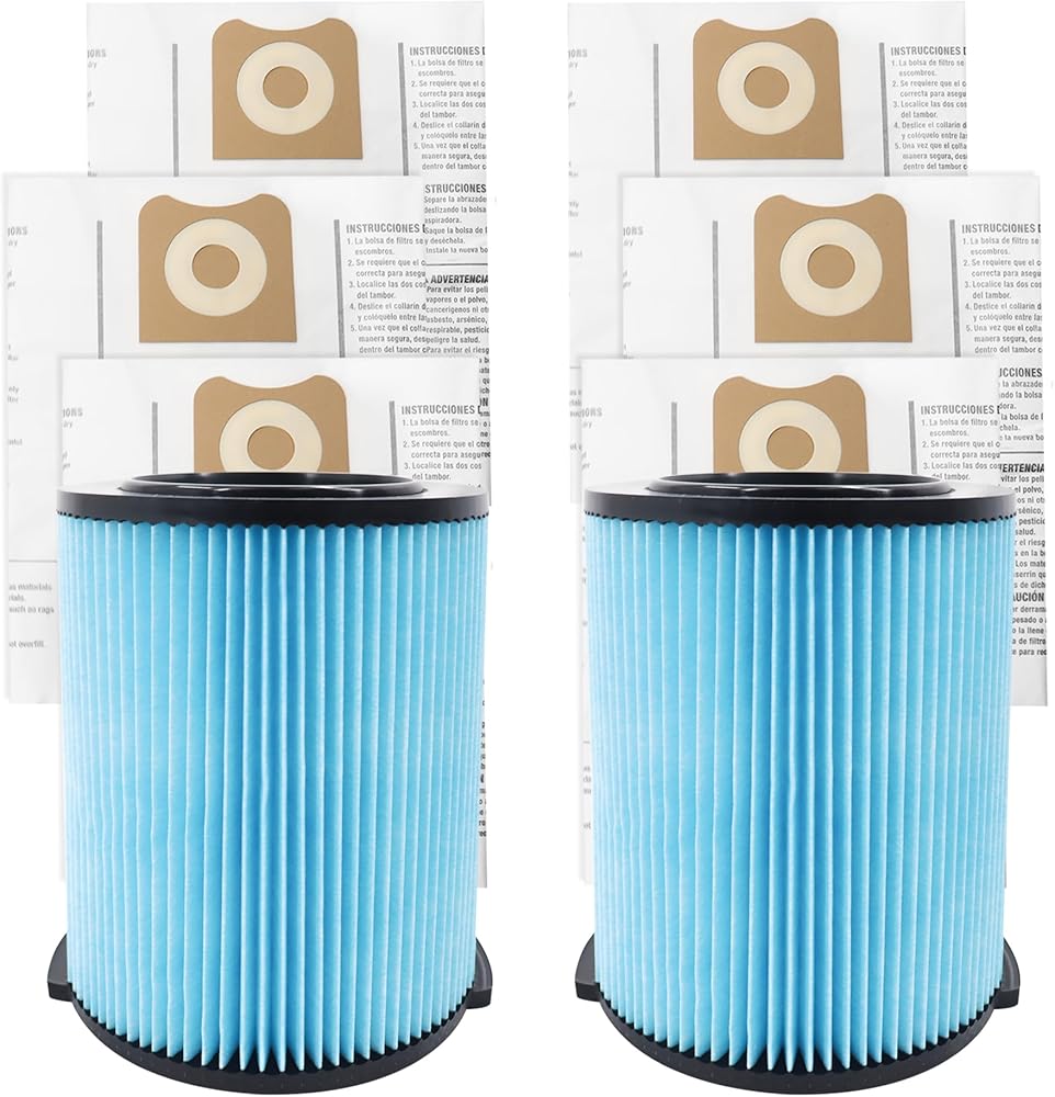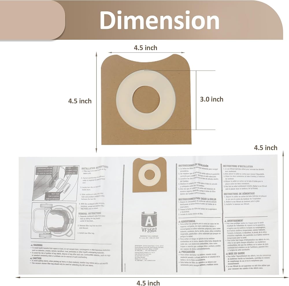 Fit Model: VF3502 vacuum bags are compatible with 12-16 Gallon vacuum WD1950 WD1956 WD1850 WD1851 RV2400HF WD1450 WD1680 WD1270 VF5000 3-Layer pleated fine dust filters are