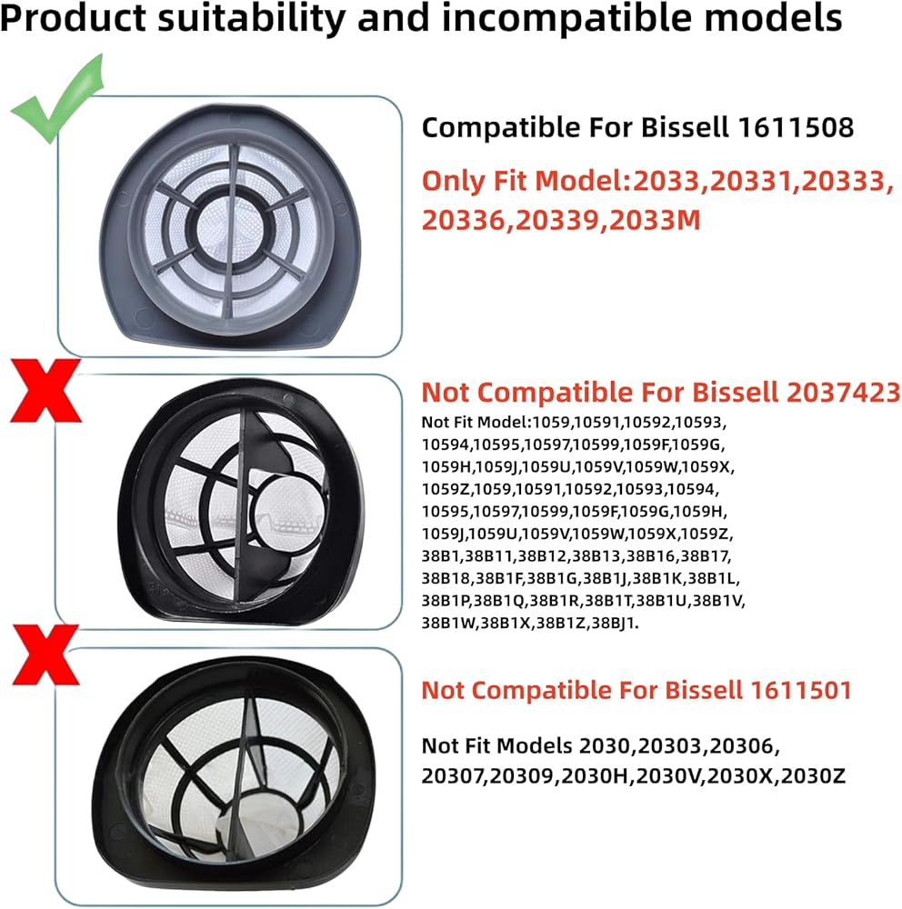1. توافق واسع: متوافق مع مكنسة بيسيل خفيفة الوزن بدون كيس 2033، 20331، 20333، 20334، 20336، 20339، 2033M، قطعة بديلة 1611508。نصائح: هذه المجموعة غير مناسبة لسلسلة بيسيل 2030، غير مناسبة لـ 1059 سلسلسلسلسلسلسلسلسلة سلسلة 8B1، يرجى التحقق من الموديل الخاص بك قبل الشراء