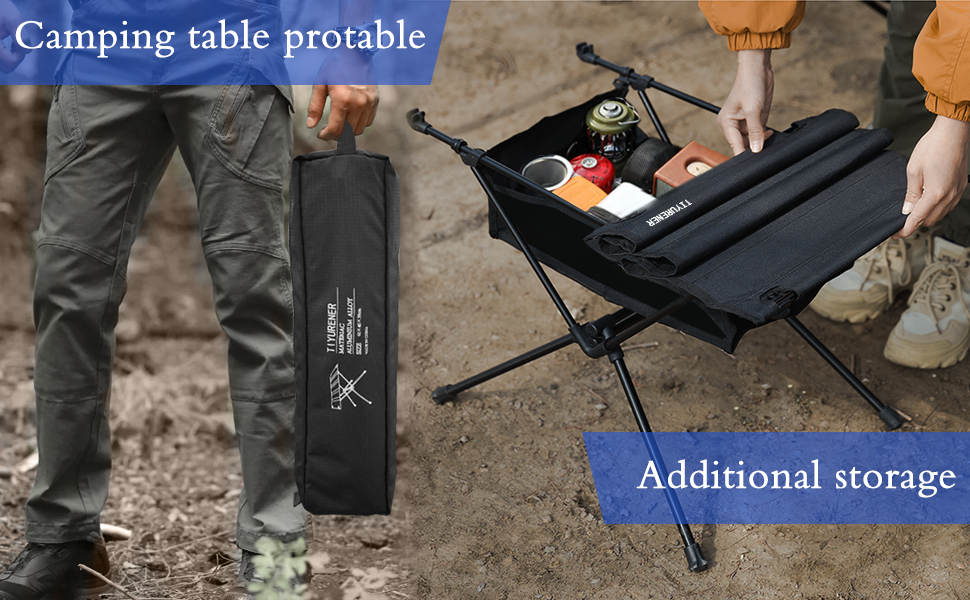 3、مساحة تخزين إضافية: طاولة التخييم المحمولة مع مساحة تخزين، سعة إضافية لوضع الأشياء الصغيرة مثل أواني الطبخ أو زجاجات المياه أو المصابيح اليدوية أو البقالة.
