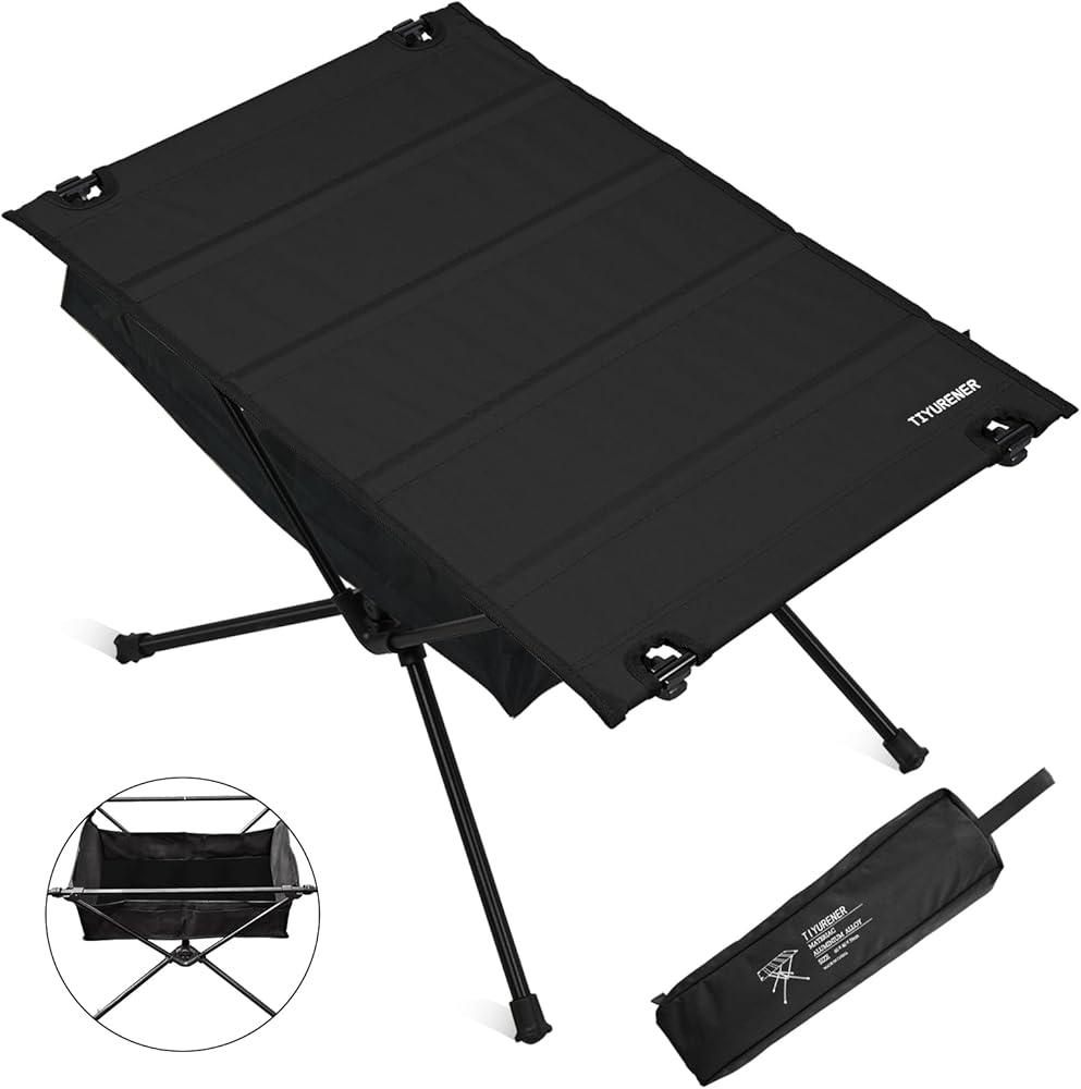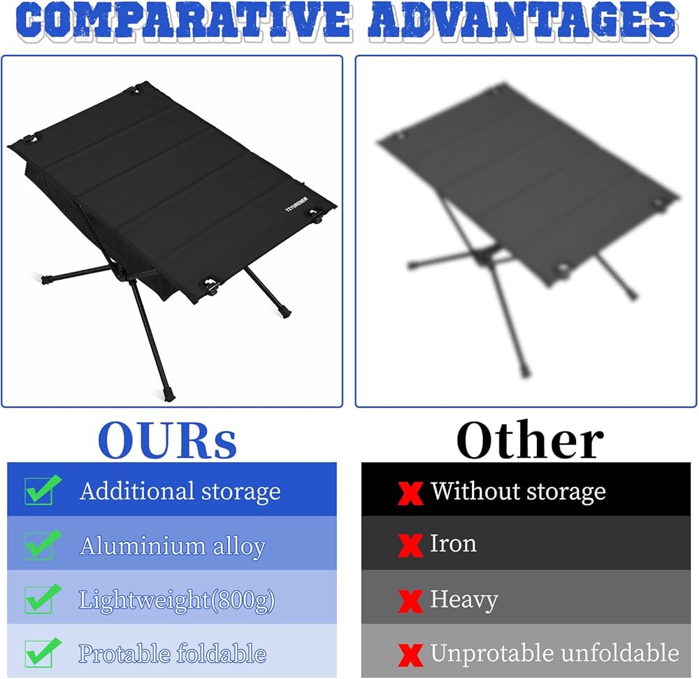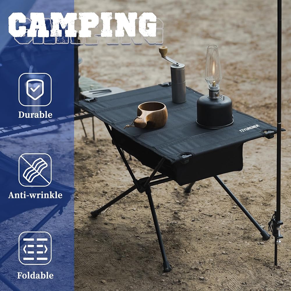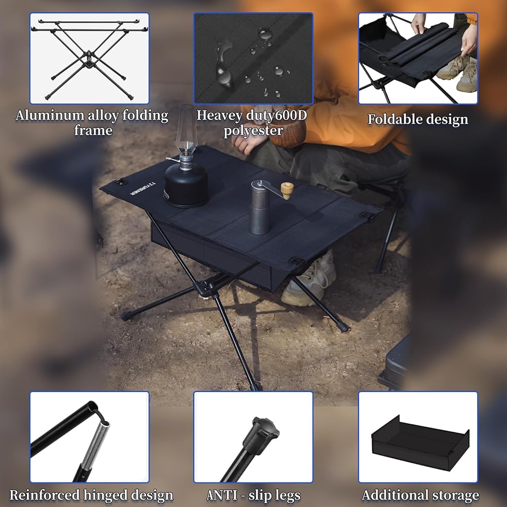متينة وقوية: طاولة التخييم مصنوعة من سبائك الألومنيوم 7075 وسطح طاولة من قماش البوليستر 600D القابل للفصل.