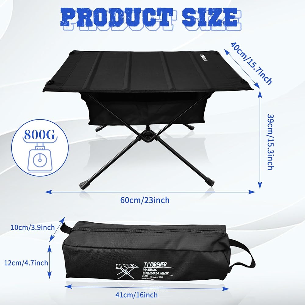 4、خفيفة الوزن صغيرة: طاولات التخييم التي يمكن طيها خفيفة الوزن، تزن فقط 1.76 باوند (0.8 كجم)، حجم العبوة 16 بوصة × 4.7 بوصة × 3.9 بوصة (41 سم × 12 سم × 10 سم)، مقاس الإعداد 23.6 بوصة × 15.7 بوصة × 15.3 بوصة (60 سم × 40 سم × 39 سم)