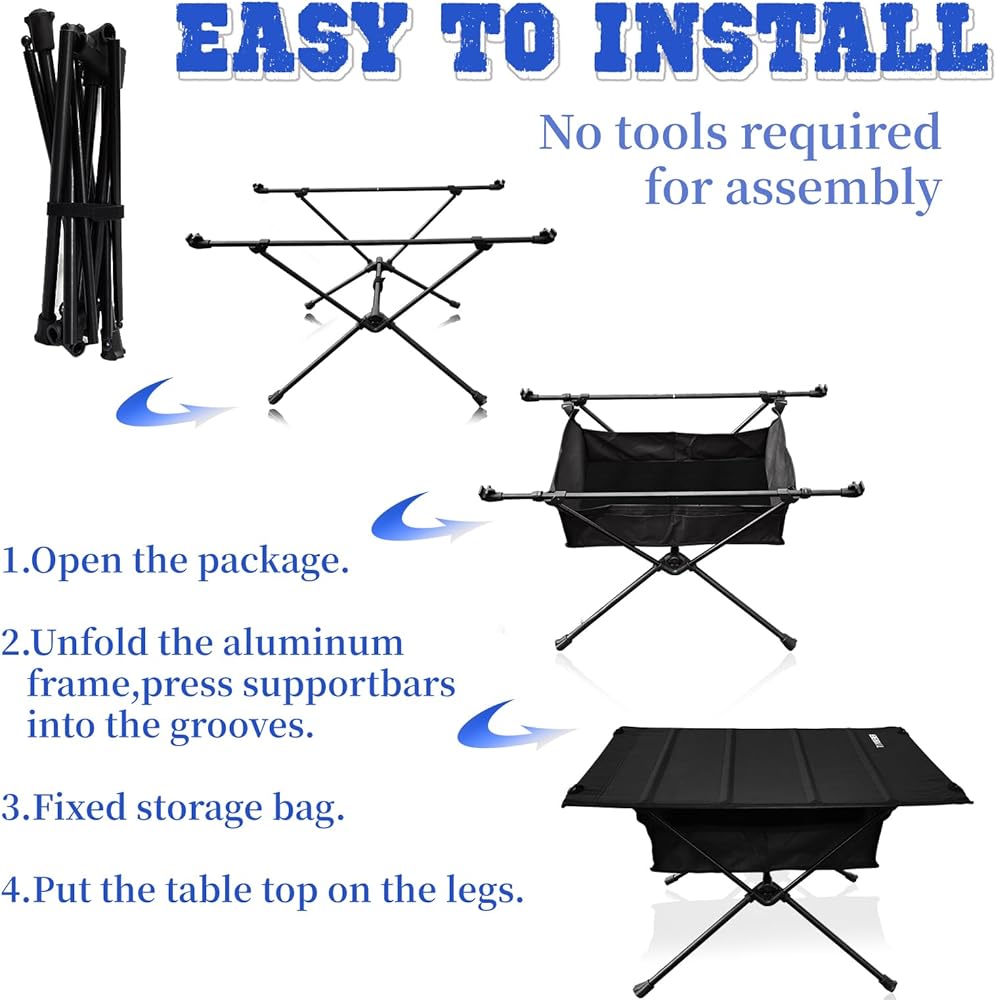 سهلة التركيب: يمكن إعداد طاولة التخييم القابلة للطي وتفكيكها دون أي أدوات، تم تصميم إطار القاعدة المصنوع من الألومنيوم لينفتح ويطوى بسهولة. يتيح تصميم المفصلات الفريد اتصالاً سهلاً وقويًا بسطح المكتب.