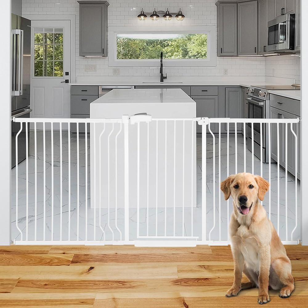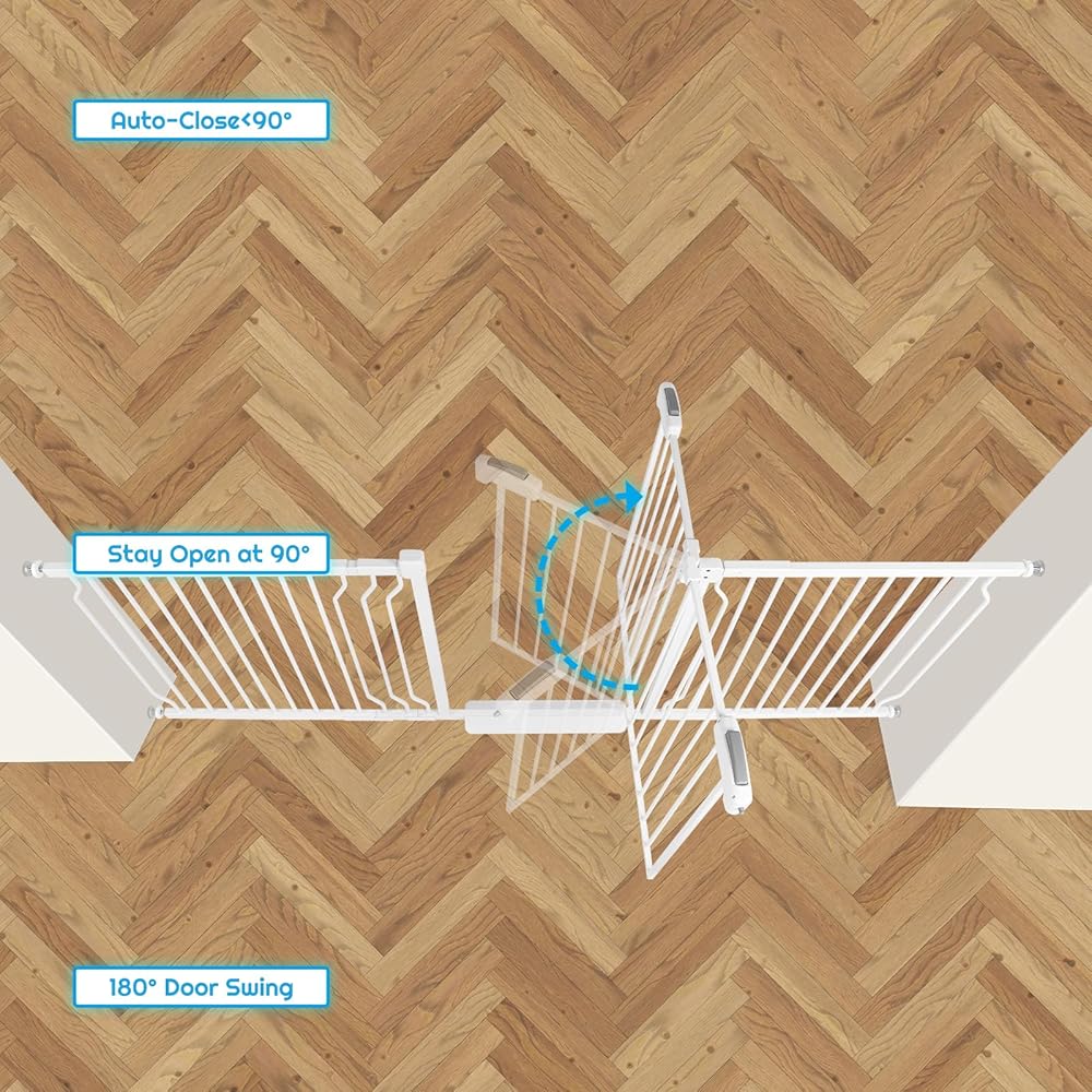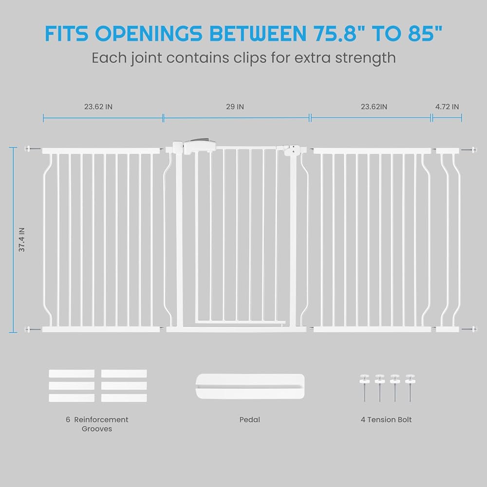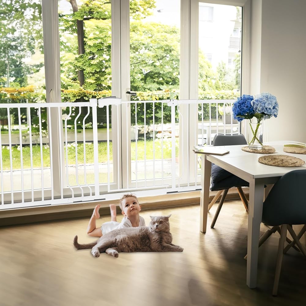 طويل جدًا وواسع: مصمم خصيصًا بارتفاع إضافي 37.4 سم، مما يسمح لك بالمرور بسهولة دون الانحناء، مما يضمن سلامة أكبر حتى أثناء حمل طفلك. يمنع في نفس الوقت الكلاب الكبيرة أو القطط الرشيقة من التسلق ويمنع القفز بشكل فعال. يمكنك ضبط عرض بوابة الأطفال من خلال إضافة أو تقليل لوحات التمديد القابلة للتكوين بثلاثة أحجام مختلفة، لتناسب الفتحة المستهدفة الواسعة أو الضيقة، الأمر الذي يعتمد عليك فقط.