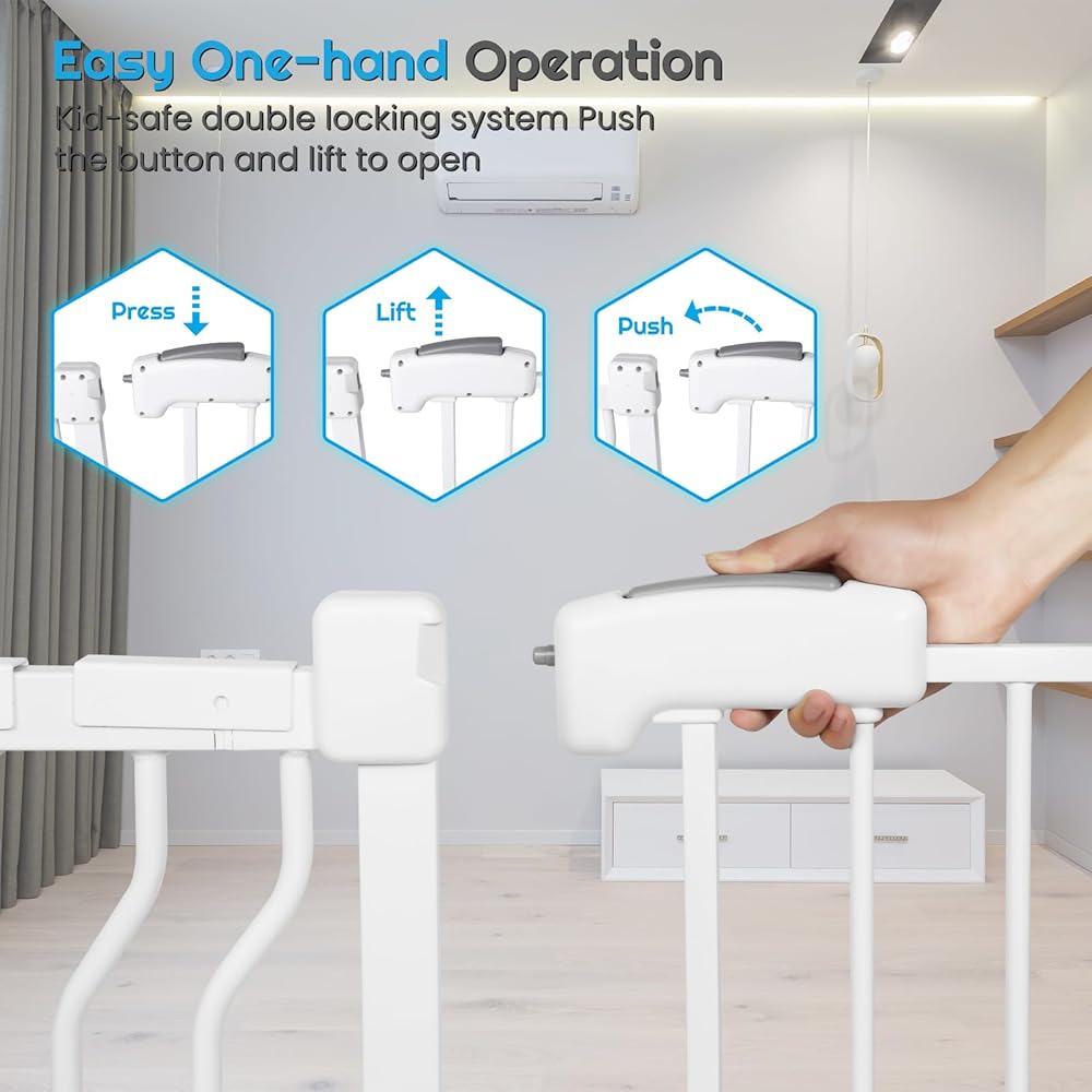 قفل مزدوج آمن وتشغيل بيد واحدة: يمكن تحرير مزلاج بوابة الأمان بمقبض مريح بيد واحدة، وهو مريح عند حمل الطفل باليد الأخرى. فقط اضغط على المزلاج لأسفل، ثم اسحبه للخلف وارفعه قليلاً. من السهل للبالغين، ولكن من الصعب على الأطفال الصغار والأطفال أو الأطفال. باب يتأرجح في اتجاهين. إذا كانت زاوية الفتح أقل من 90 درجة، فسيتم إغلاق بوابة الأطفال تلقائيًا؛ ولكن إذا كانت زاوية الفتح أكثر من 90 درجة، فستستمر بوابة الطفل في الفتح.
