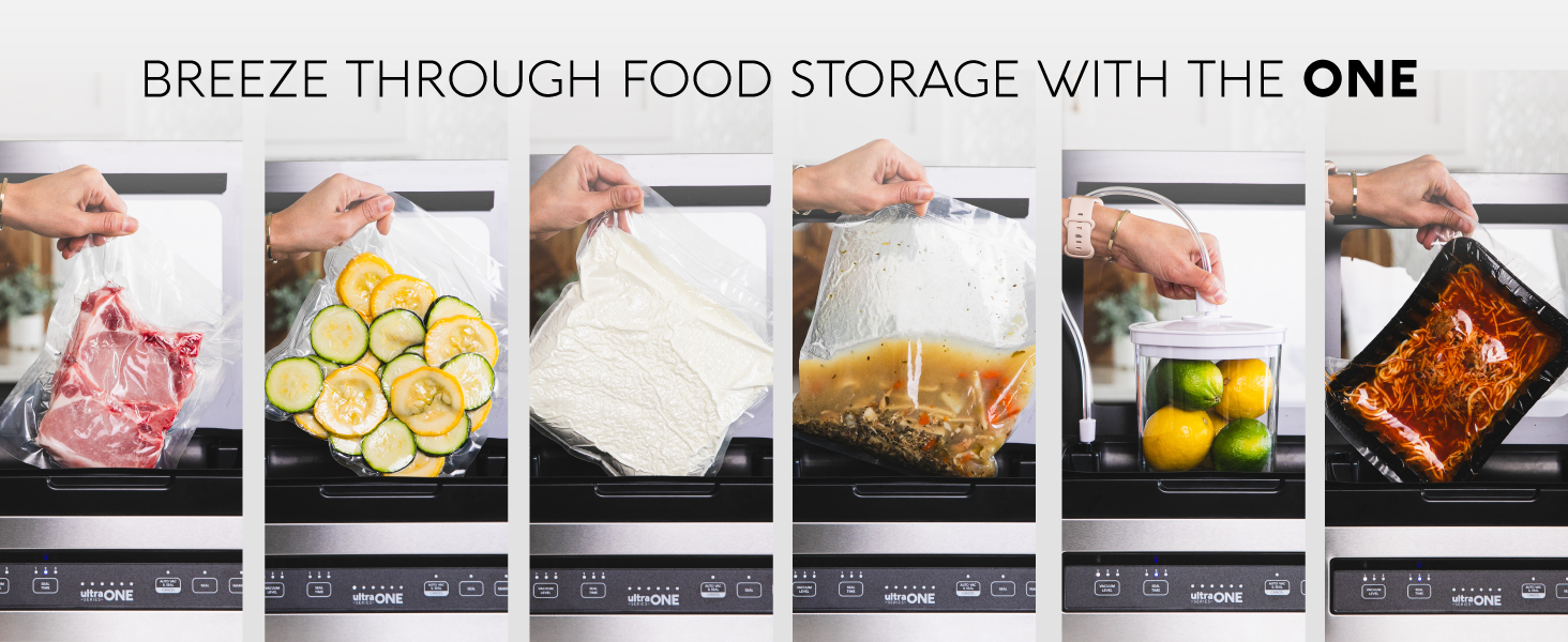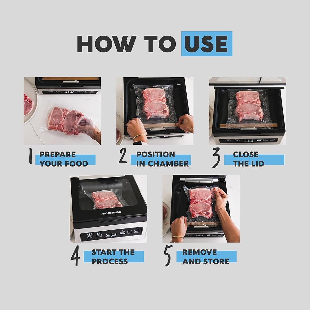 أصبح التتبيل سهلاً - على عكس أدوات ختم الطعام العادية، تتيح لك آلة ختم المطبخ الخاصة بنا تتبيل المواد الغذائية في حجرة الشفط. ضع اللحم في عبوات مفرغة من الهواء حتى يفتح الطعام سطحه ثم انقعه في التتبيلة لمدة دقائق.