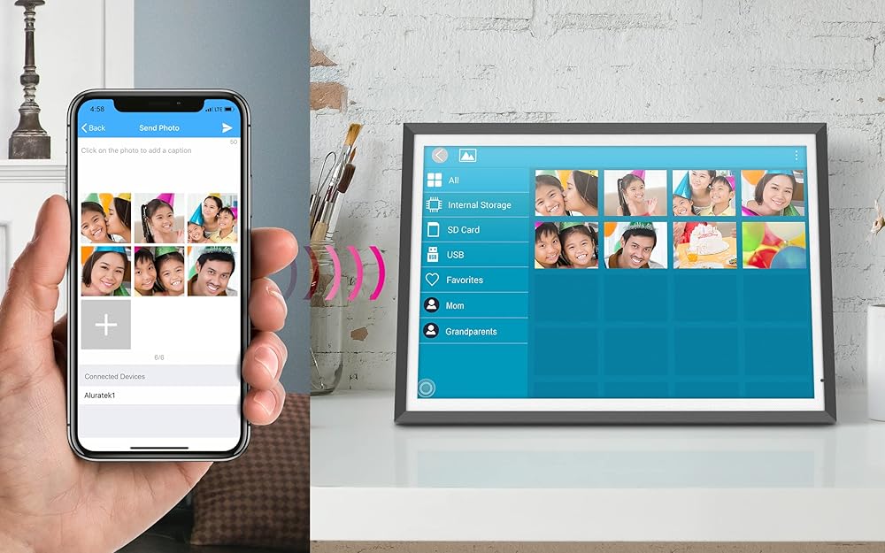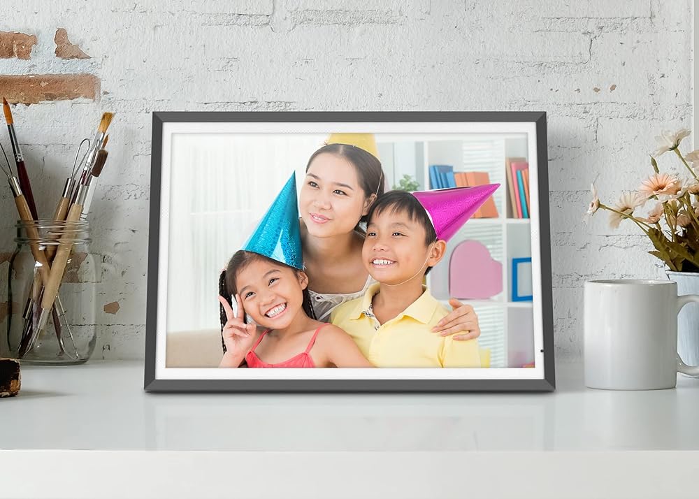 Overview 13.5"Touchscreen Display 3K resolution! Your digital photos will be displayed clearer and vibrant on the IPS LCD panel. Multimedia Support In addition to photos, enjoy video, music and slideshow play. Features integrated speakers. Wireless Photo Sharing Send photos and videos from your mobile device to the frame using the Frametime app. Light Sensor Activated The digital frame will automatically power on when you turn on the light in the room. Built-in Memory Transfer and store fileseasily to the frame's32GB built-in memory MicroSD/USB Support Insert a MicroSD/HC/XC card or USB flash drive into the card slot to instantly view your photos. Easy To Use Fast and easy navigation through the icon based menus with no setup or software to install. Clock, Calendar, Weather Display the time and day and check what to wear so you are always prepared for the day. Details FEATURES: 13.5” Touchscreen IPS LCD at 3000 x 2000 (3K) resolution (3:2 aspect ratio) Connects easily to any WiFi 802.11 b/g/n wireless network, Dual-band 2.4Ghz, 5Ghz Send photos to the frame using our smartphone app, Facebook Messenger, Twitter Messages or even through email! Supports various picture, video and audio formats Configure photo slideshows to play in various interval and transition effects set to background music Supports MicroSD / MicroSDHC / MicroSDXC memory cards (up to 64GB) Connect a USB flash drive or MicroSD card to easily access and share your favorite pictures, music, or videos Transfer and store files quickly and easily from your personal computer to the frame's 32GB built-in memory Includes built-in clock, calendar, alarm and weather apps Wall mountable Limited 2 Year Warranty REQUIREMENTS: WiFi network or mobile internet connection PC and MAC support for data transfer to frame's built-in memory TECH SPECS: Memory: Built-in 32GB Connectivity - WiFi / USB 2.0, MicroSD Resolution - 3000 x 2000 (3:2 aspect ratio) Viewing angle (left / right / up / down): 45 / 45 / 15 / 35 WARRANTY: 1 year DIMENSIONS / WEIGHT: 12.5 x .63 x 9 in. (31.7 x 1.6 x 22.8 cm) MODEL NUMBER / UPC: AWS13F / 8-12658-01510-3 PACKAGE CONTENTS: 13.5" Dual-band 2.4Ghz, 5Ghz WiFi Touchscreen Digital Photo Frame with 3K Resolution Frame Stand Power Adapter USB Cable Instructional Manual DOWNLOADS: ↓ AWS13F_Manual_English ↓ AWS13F_Manual_French Application