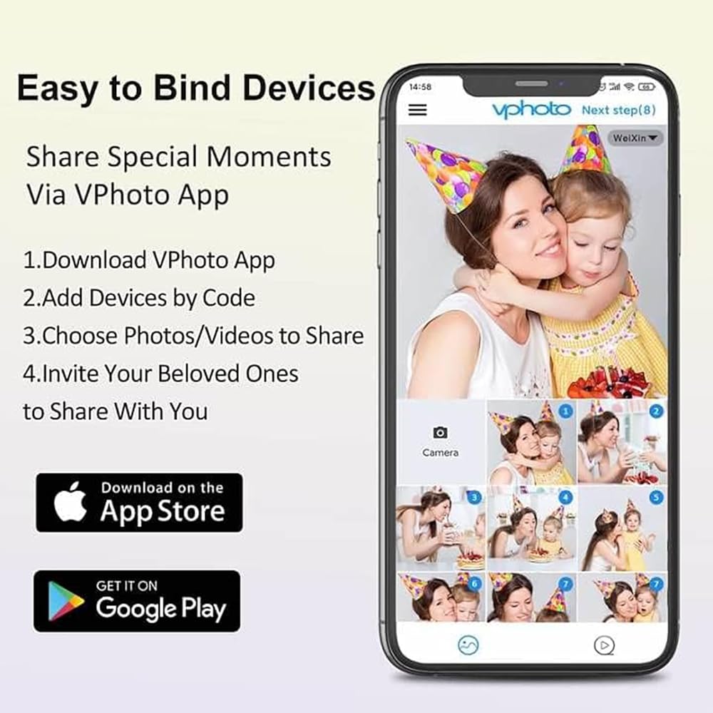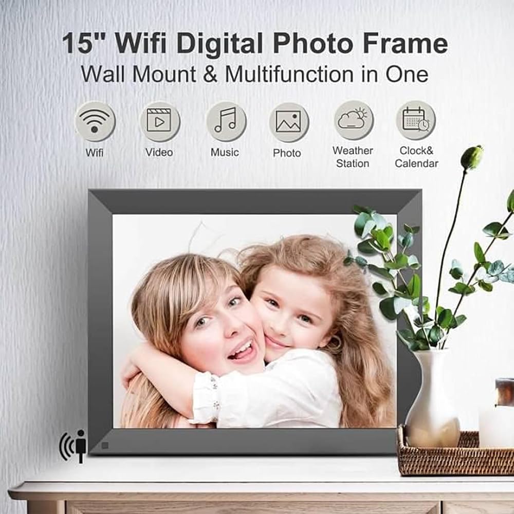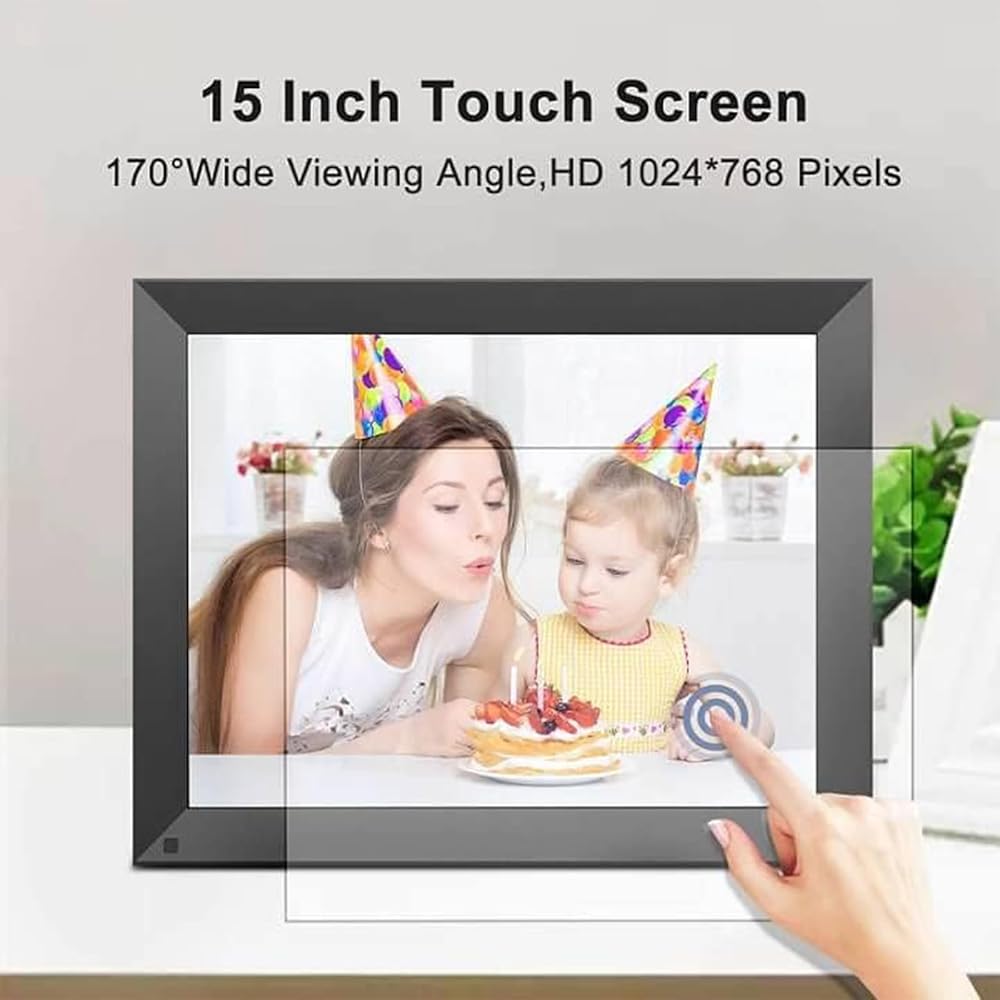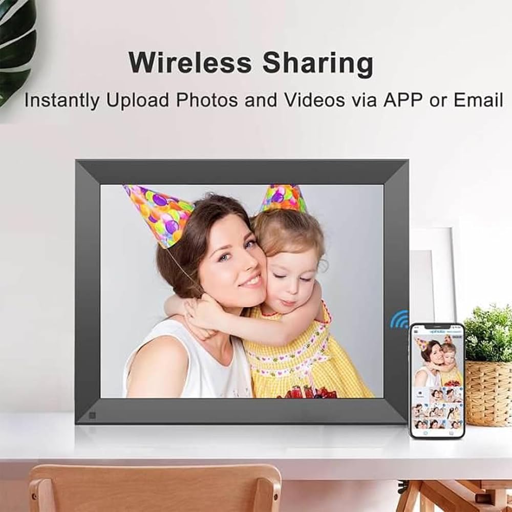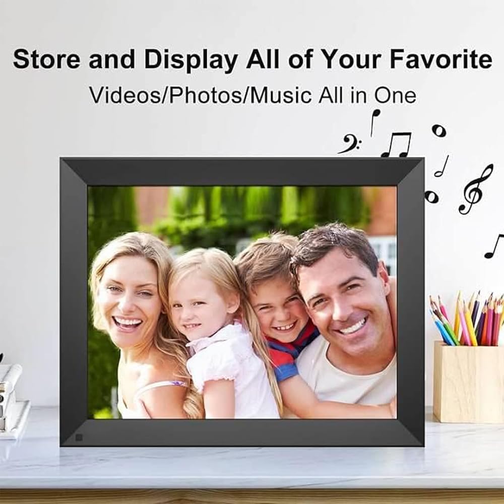 This 15-inch HD digital photo frame with email features a stylish and exquisite design that perfectly fits into modern home decor. This big digital photo frame has an HD touchscreen display and supports various functions like video playback, alarm, clock, weather, auto-rotate, calendar, photo folders, music, slideshows, motion sensor and text captions. Using our exclusively developed app "VPhoto", the digital picture frame cloud enables fast and secure wireless transfer of photos and videos without any quantity limits. Family and friends are free to upload as many photos or videos as they like. With 32GB of storage, it can hold a large number of photos and videos for you to relive life's moments anytime. This digital picture frame can be wall-mounted or placed on a table, suiting for a variety of occasions. It makes an ideal gift for parents, lovers or friends on Father's Day, Mother's Day, birthdays, weddings, Thanksgiving, Christmas or any other special day.