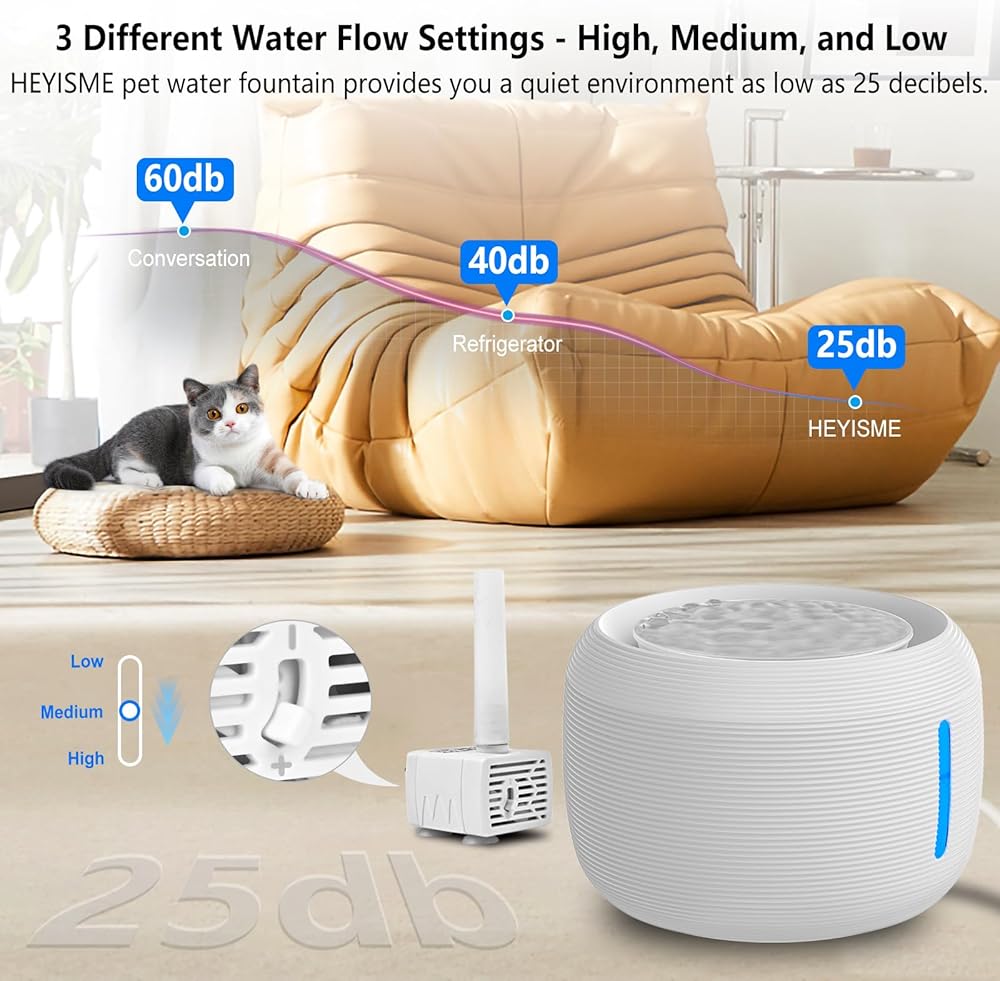• 3 مرشحات بديلة، 3 أوضاع تدفق ونافورة مياه للحيوانات الأليفة صامتة تقريبًا: تحتوي نافورة المياه HEYISME Cat المطورة على 3 أوضاع لتدفق المياه (عالية ومتوسطة ومنخفضة) لتلبية احتياجات الحيوانات الأليفة المختلفة. يأتي كل منها مع 3 عبوات من فلاتر نافورة مياه القطط. تعمل أحدث مضخة هادئة في عام 2023 على تقليل الصوت إلى 25 ديسيبل فقط. استعد لليالي هادئة، وستكون أنت وحيواناتك الأليفة خاليين من أي قطرات أو رذاذ مياه مزعج. ابحث عن ASIN B0CD7F5ZCJ لمزيد من استبدال الفلاتر في متجرنا.