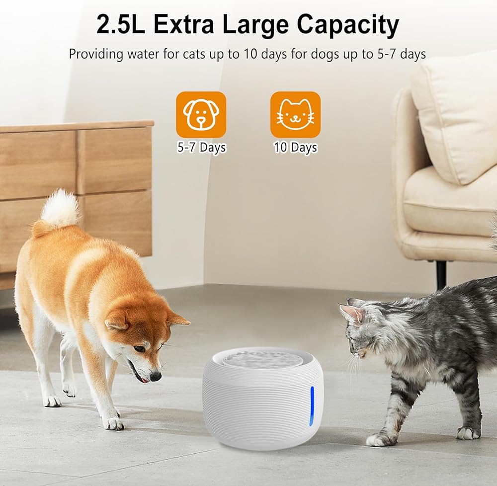 • سعة مياه كبيرة: مع احتياطي مياه ضخم يبلغ 2500 مل وصينية مياه إضافية سعة 110 مل توفر الماء أثناء انقطاع التيار الكهربائي، نضمن ترطيب قطتك. توفر السعة الكبيرة مياه كافية تدوم لأكثر من 10 أيام للقطط، و5 أيام لكلب متوسط ​​وصغير الحجم، وهي مثالية لاحتياجات الشرب المتوسطة لحيوان أليف واحد.