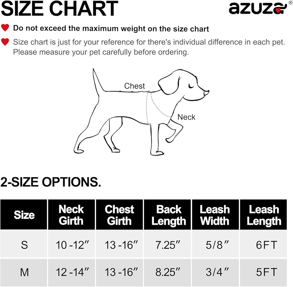 المقاس M - الرقبة 12 - 14 بوصة، محيط الصدر 13 بوصة - 16 بوصة، طول الظهر 8.25 بوصة، مقود مجاني بطول 5 أقدام مع كل عملية شراء. يرجى قياس كلبك والرجوع إلى مخطط نطاق المقاسات الخاص بنا قبل الطلب. [نصائح ودية] - إذا لا تزال محتارًا بين خيارين للمقاسات، يرجى اختيار المقاس الأكبر.