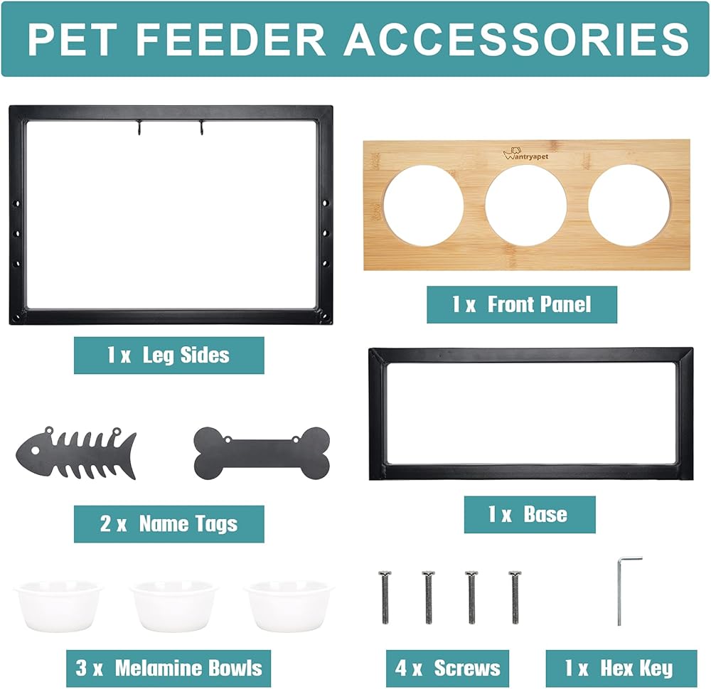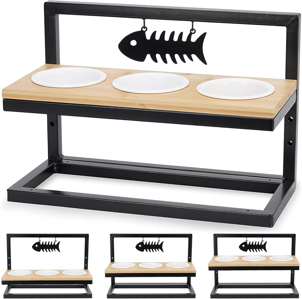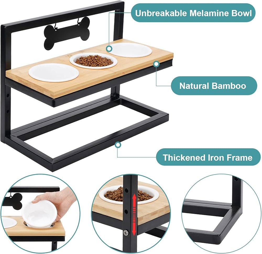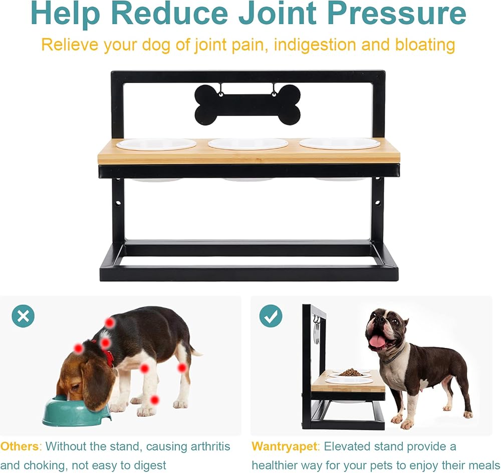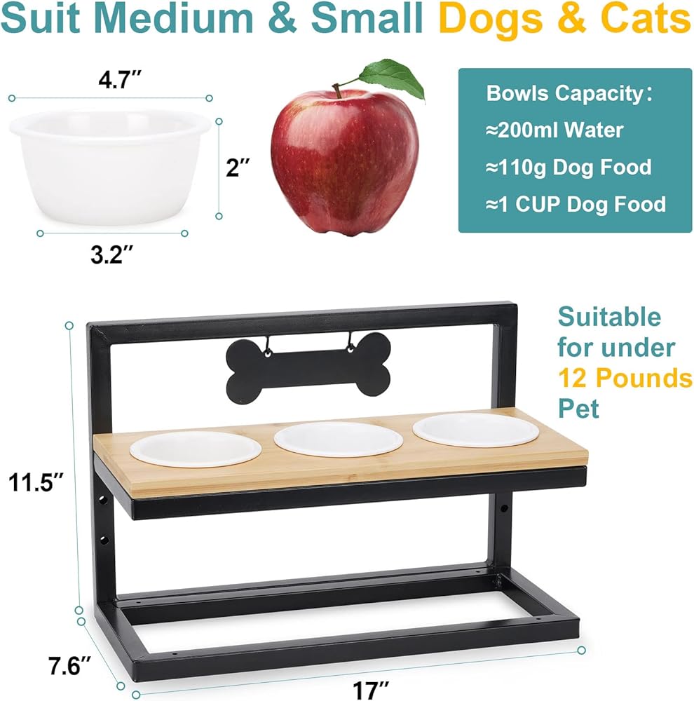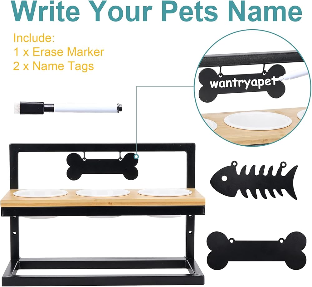 WANTRYAPET أوعية تغذية الحيوانات الأليفة المرتفعة للقطط أو الكلاب الصغيرة، 3 ارتفاعات قابلة للتعديل مع 3 أوعية ميلامين ممتازة، محطة تغذية ثلاثية خشبية مرتفعة مع علامتي اسم وعلامة