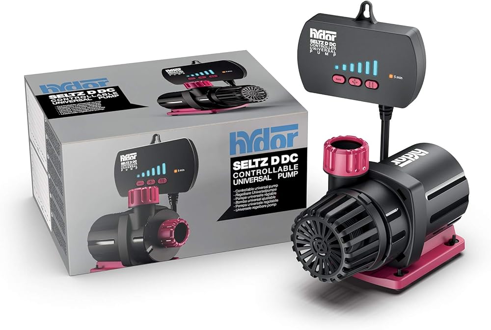 Hydor Seltz D DC Controllable Universal flow water pump. Whether you are a marine hobbyist or a passionate freshwater aquarist, know that Hydor's Seltz D DC Controllable pumps are the perfect fit for your aquarium needs. The pumps feature innovative 6 pole electronic motor for energy savings. The pumps are controllable through the enclosed electronic controller to increase or decrease the flow at 6 preset points and has a feeding mode to pause the flow of the pump for feeding or maintenance inside the aquarium. The pumps can be used in-line or submerged, they are equipped with sensors that detect the presence of water moving through the pump so it will shut off the pump to prevent damage if no water is sensed. This space-saving DC Universal water pump features gallon ranges from 500 to 1000 and will pump head heights of 12.5 feet, depending upon the premium model you choose from Hydor. Use in freshwater or saltwater aquariums, bringing the best of aquarium technology to your home or office. It's simple to use