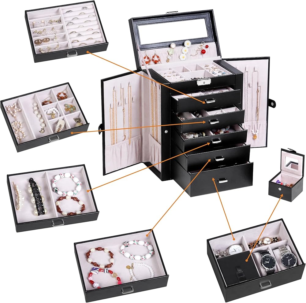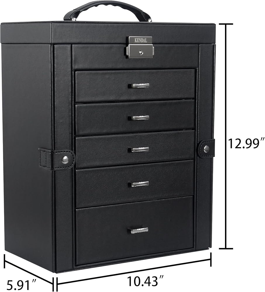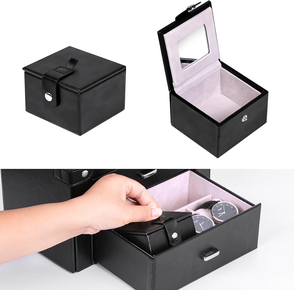 تتضمن خمسة أدراج قابلة للإزالة لتخزين المجوهرات بشكل مثالي (يرجى الرجوع إلى الصورة للحصول على تفاصيل المقاس). وينقسم الدرج السفلي الأعمق إلى خمس حجرات، يمكن لأحدها أن تستوعب حقيبة السفر الصغيرة، بينما يمكن استخدام وسادتين للساعة داخل المساحات لتأمين الساعات.