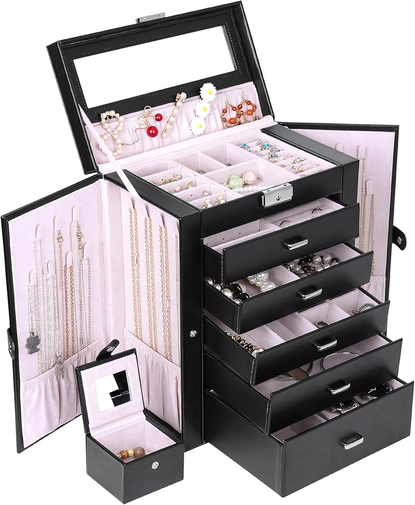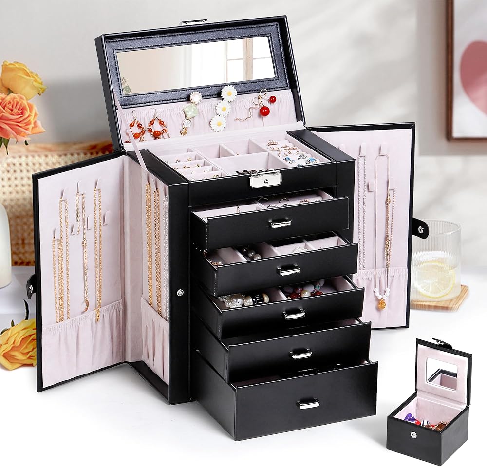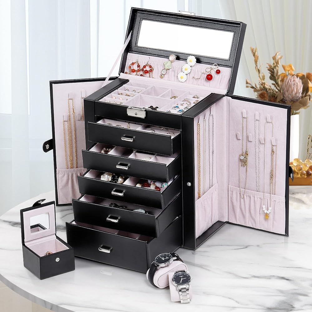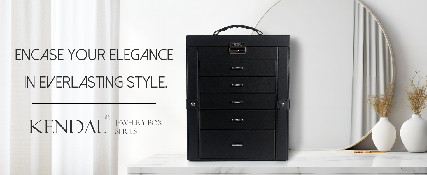 تتضمن خمسة أدراج قابلة للإزالة لتخزين المجوهرات بشكل مثالي (يرجى الرجوع إلى الصورة للحصول على تفاصيل المقاس). وينقسم الدرج السفلي الأعمق إلى خمس حجرات، يمكن لأحدها أن تستوعب حقيبة السفر الصغيرة، بينما يمكن استخدام وسادتين للساعة داخل المساحات لتأمين الساعات.