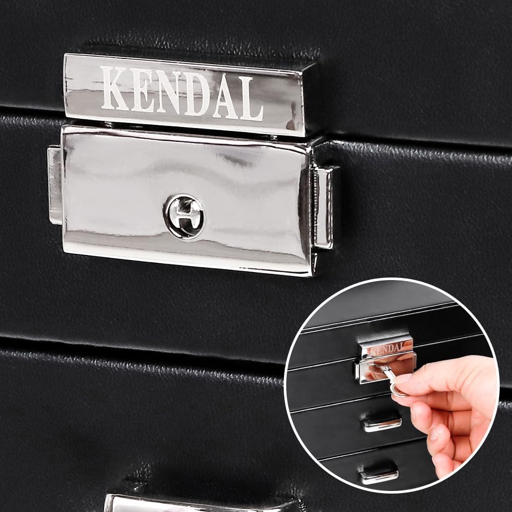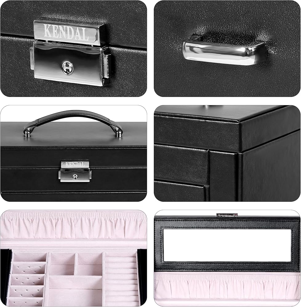 يتميز صندوق المجوهرات هذا، بلمسة نهائية من جلد البولي يوريثان الأسود، ببطانة من نسيج الجلد السويدي مصنوعة يدويًا. تتضمن لوحتين مفتوحتين على الجانب، كل منهما يقدم 11 خطافًا للقلادة للعرض.