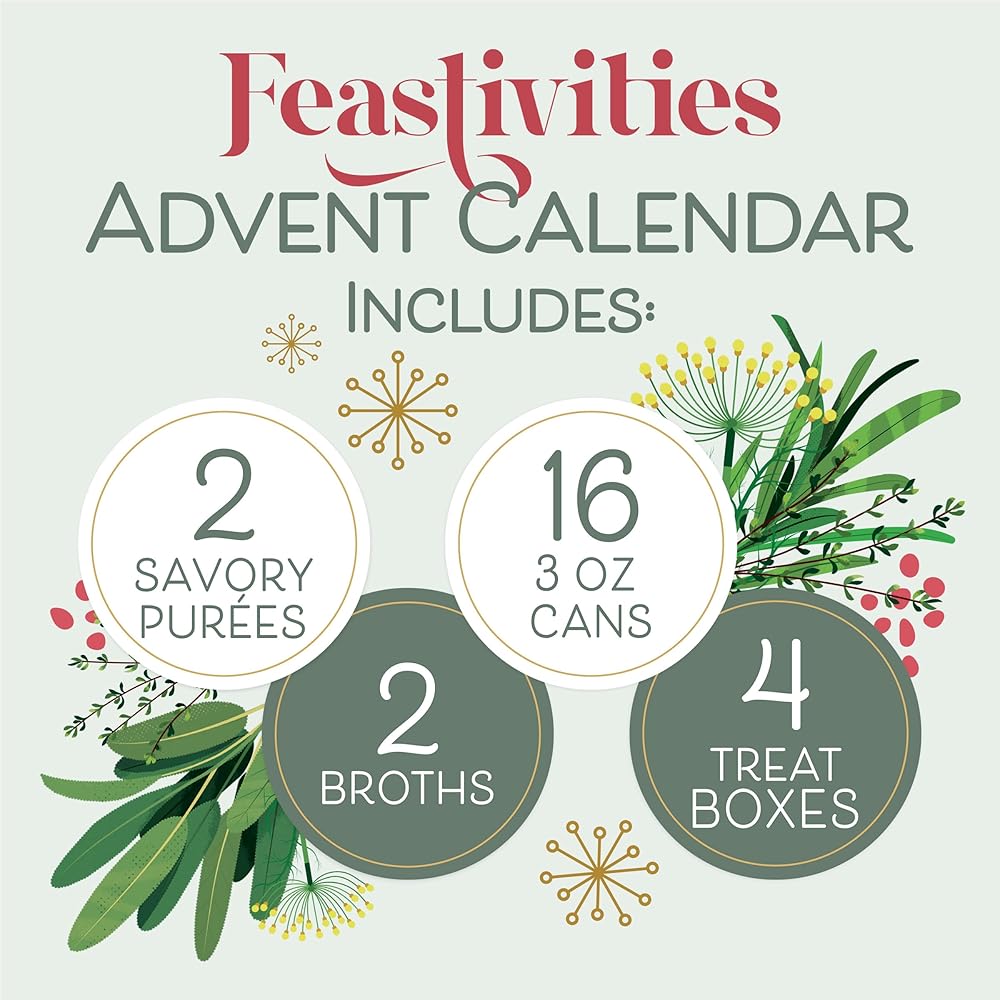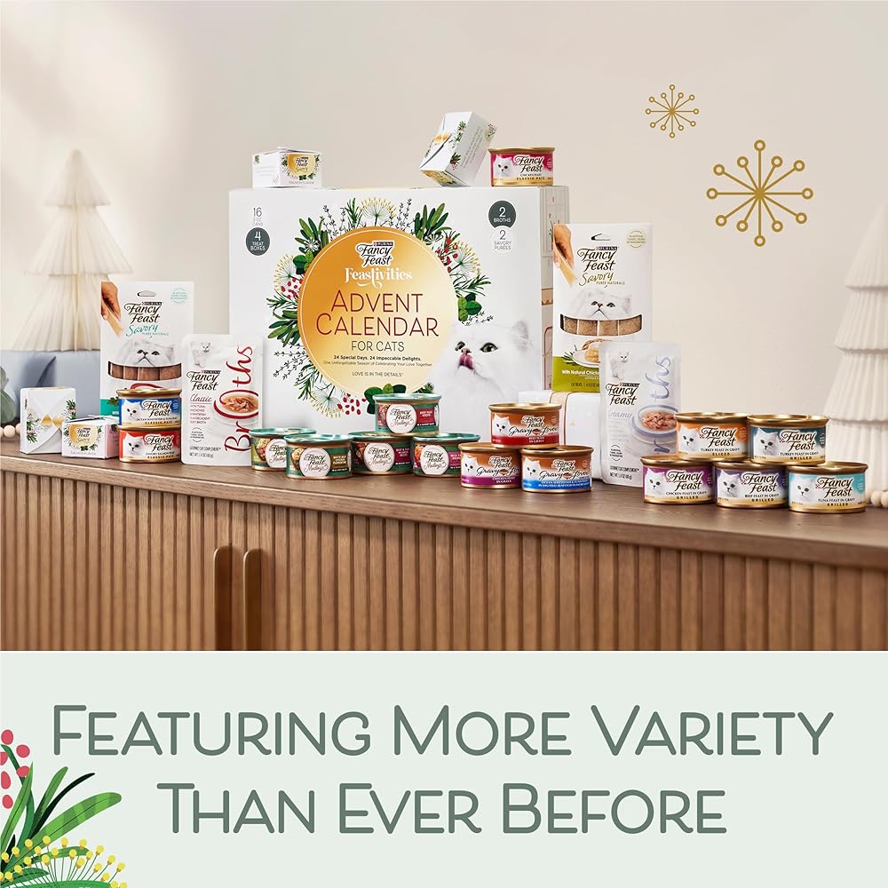 Delight your cat this holiday season with a Fancy Feast Feastivities Advent Calendar Gourmet Wet Cat Food, Cat Complements and Cat Treats. For a limited time, you can gift this cat advent calendar with treats and a variety of mouthwatering Fancy Feast wet cat food recipes and complements for your cat. Included are 16 different Fancy Feast recipes in 3 oz. cans, 2 flavors of savory and tempting break-apart treats, 2 different broth recipes, and 2 flavors of Fancy Feast Savory Puree Naturals. Each Fancy wet cat food recipe is 100 percent complete and balanced for adult cats and made with flavorful ingredients like ocean whitefish, salmon, tuna, chicken, turkey, pork or beef. This pet advent calendar also includes QR codes for unique recipes for people and a festive Fancy Feast holiday Spotify playlist. Enhance the special bond you share with your cat by making a Fancy Feast Feastivities Advent Calendar Gourmet Wet Cat Food, Cat Complements and Cat Treats a holiday tradition.