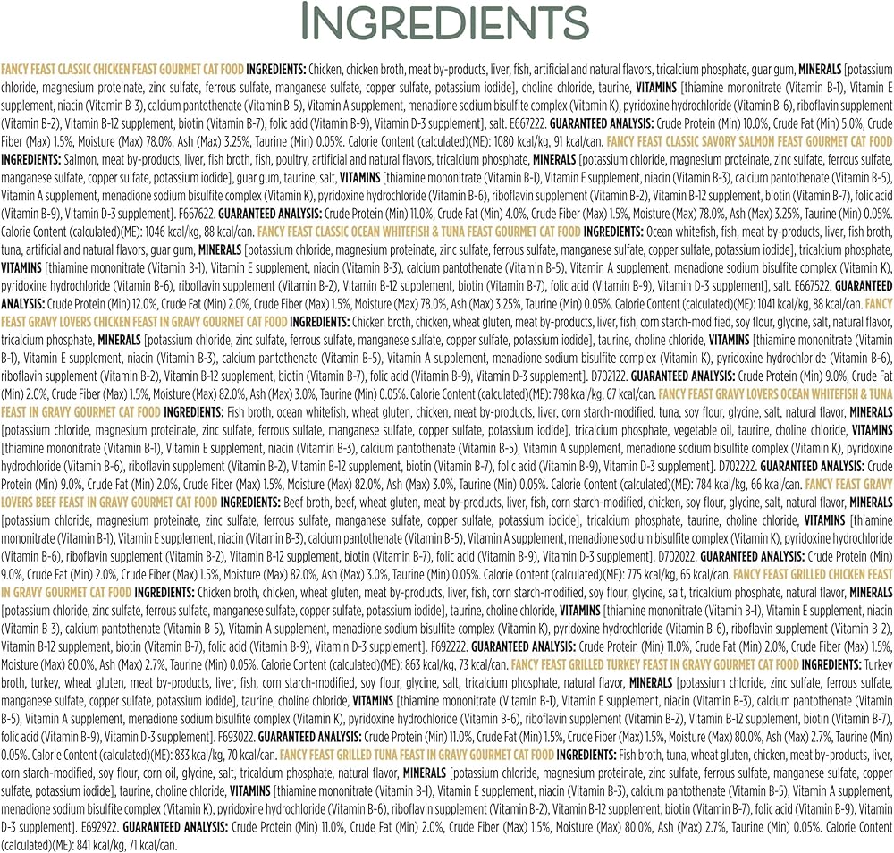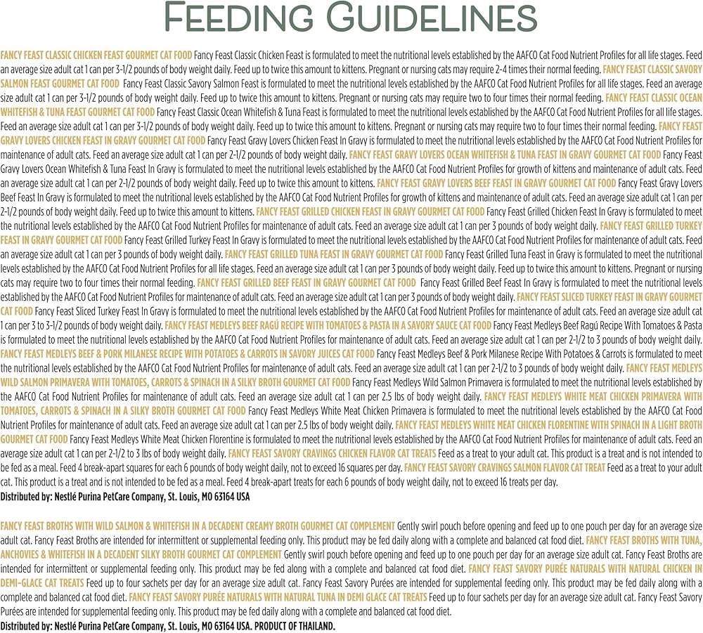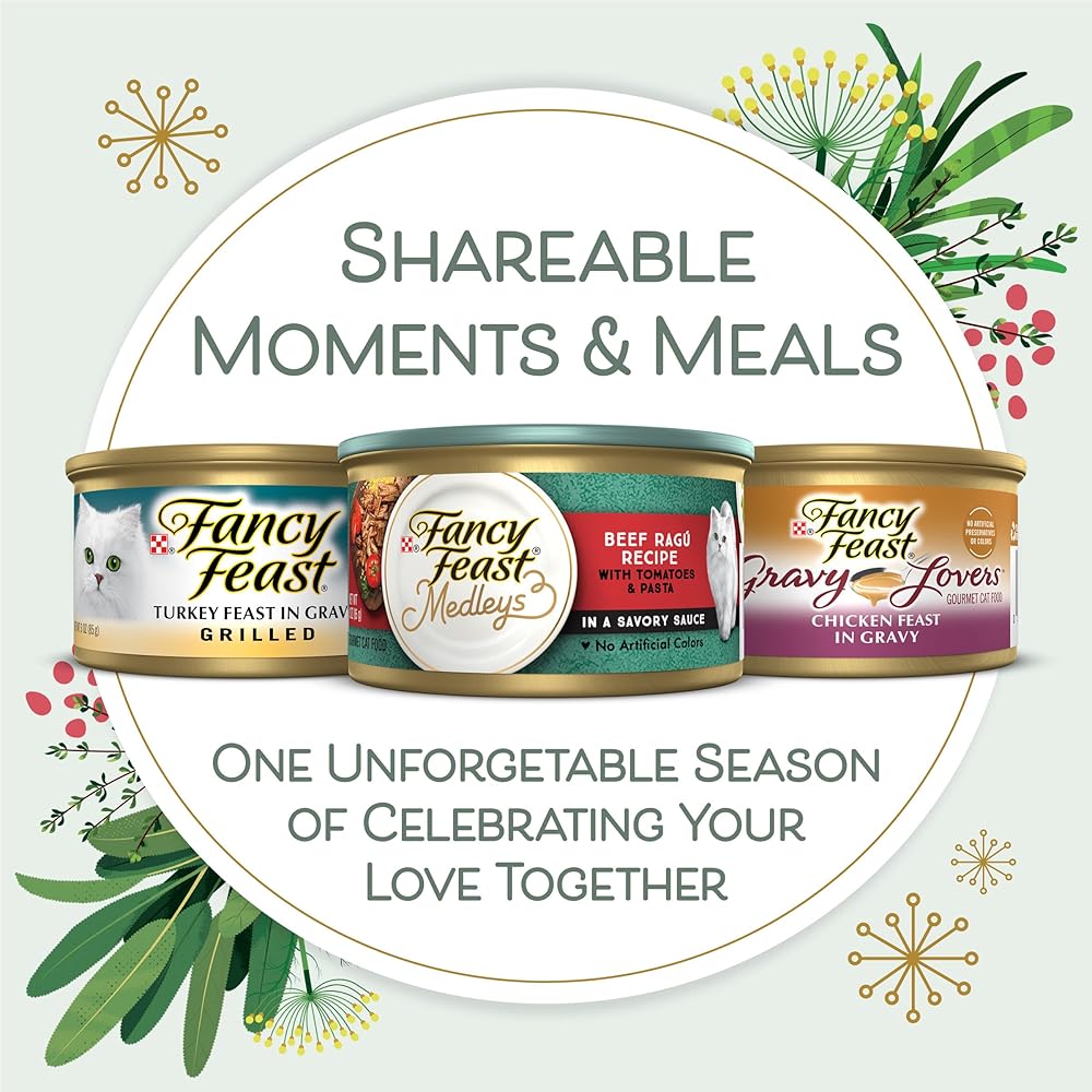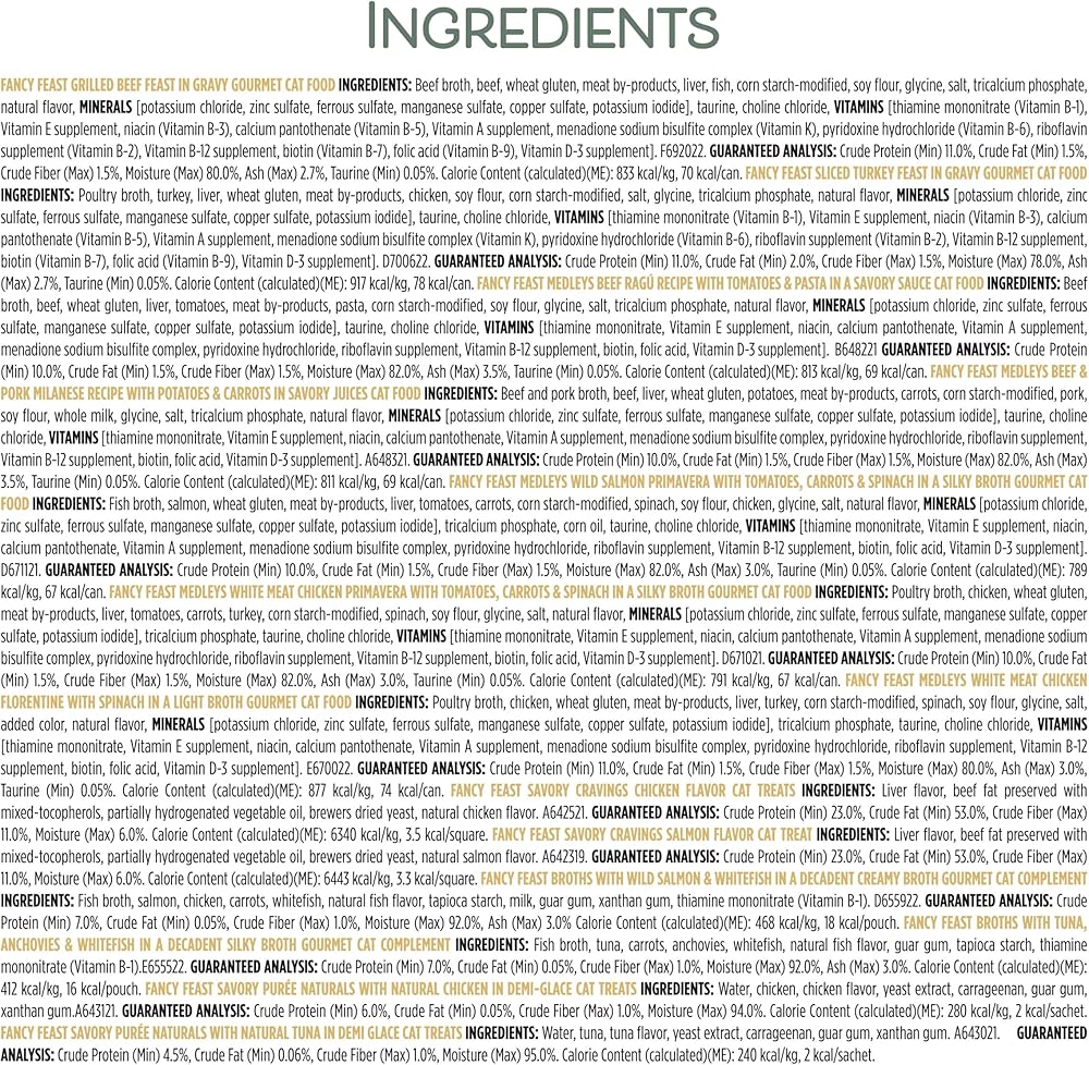 Featuring more variety than ever with 16 different delicious Fancy Feast recipes in 3 oz. cans, 2 flavors of savory break-apart treats, 2 different broth recipes, and 2 flavors of Fancy Feast Savory Puree Naturals