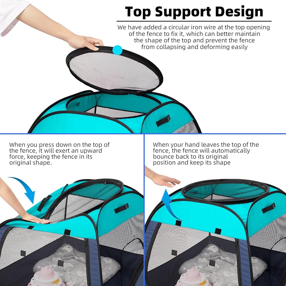 قوي ومتين: قفص لعب الحيوانات الأليفة مصنوع من البوليستر بنسبة 100% أكسفورد 600D وشبكة متينة مضادة للتمزق. مع إطار فولاذي وسحاب من النايلون، يبدو حيوانك الأليف الخارجي بالكامل قلعة قوية.