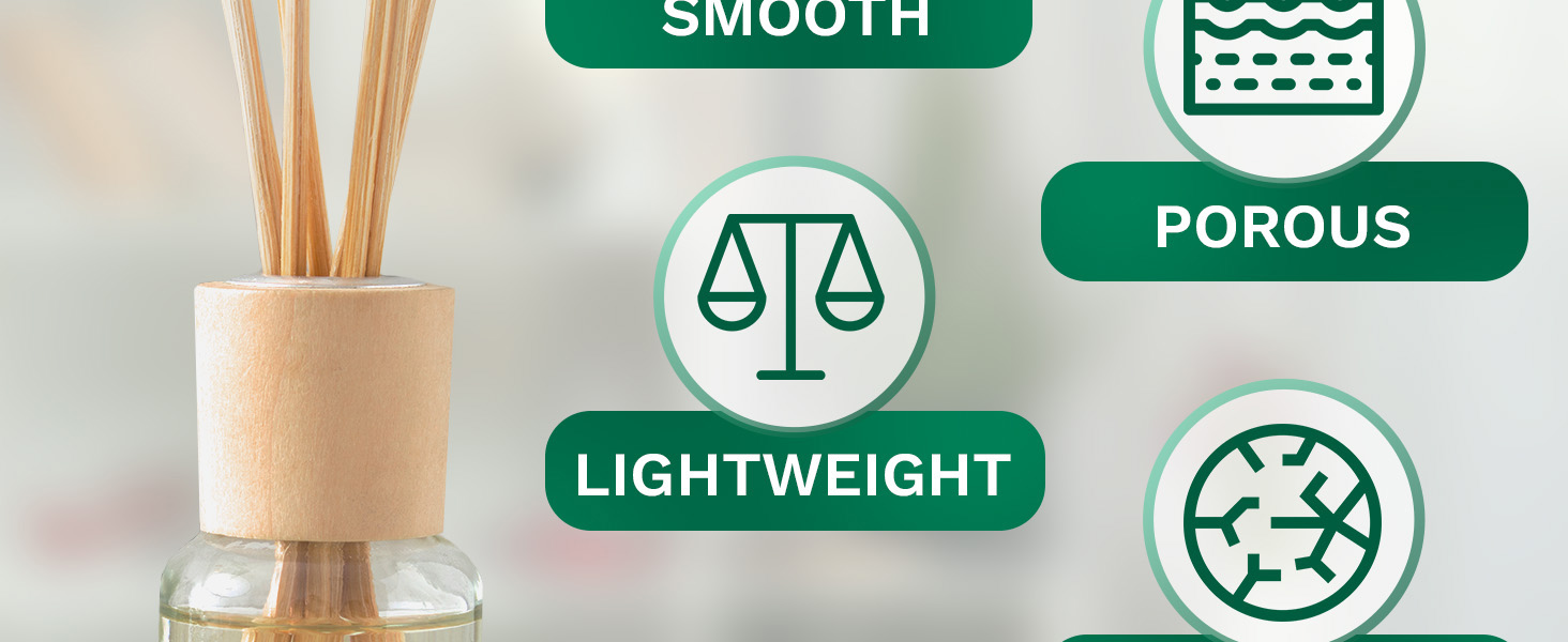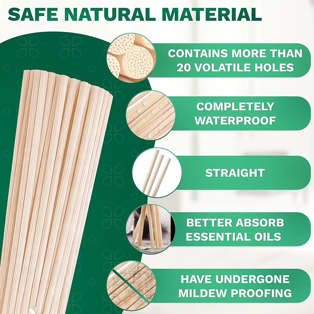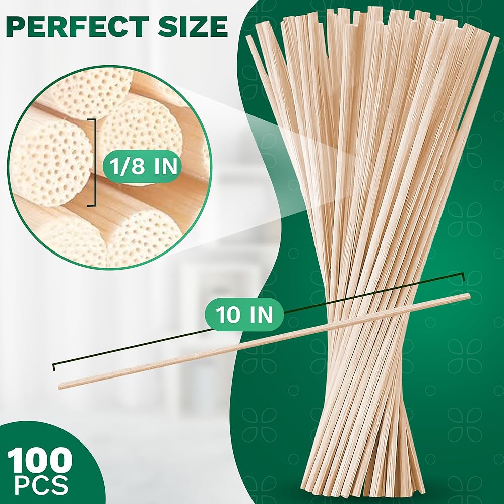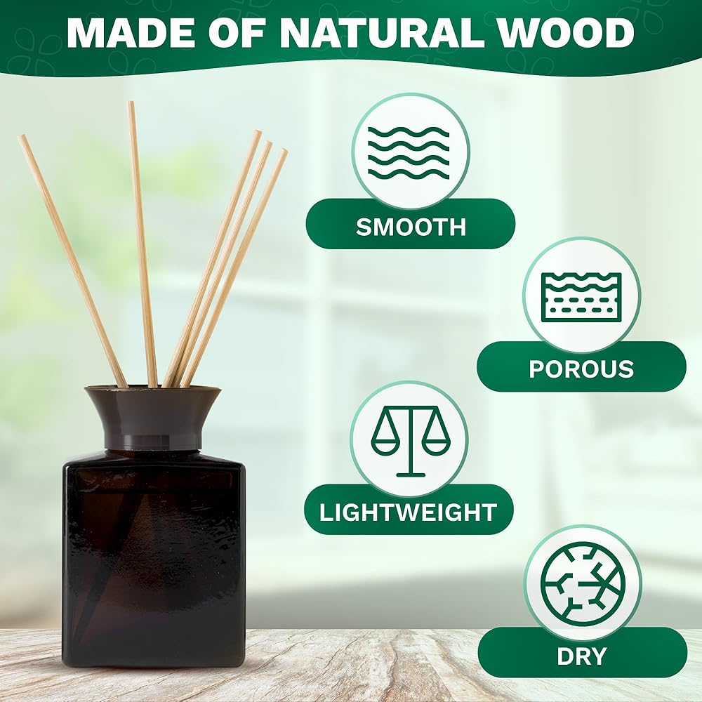 حجم العصا الخشبية: يبلغ طول عصا الروائح الخشبية للزيوت العطرية حوالي 10 بوصات وقطرها حوالي 1/8 بوصة. تتميز هذه العصي الخشبية الناشرة للعطور الزيتية بحجم جيد جدًا ومثالي لوضعها في أجهزة توزيع الزيوت العطرية الصغيرة. يبدو الناشر الأساسي للزيت المستقيم جميلًا وجذابًا للغاية.