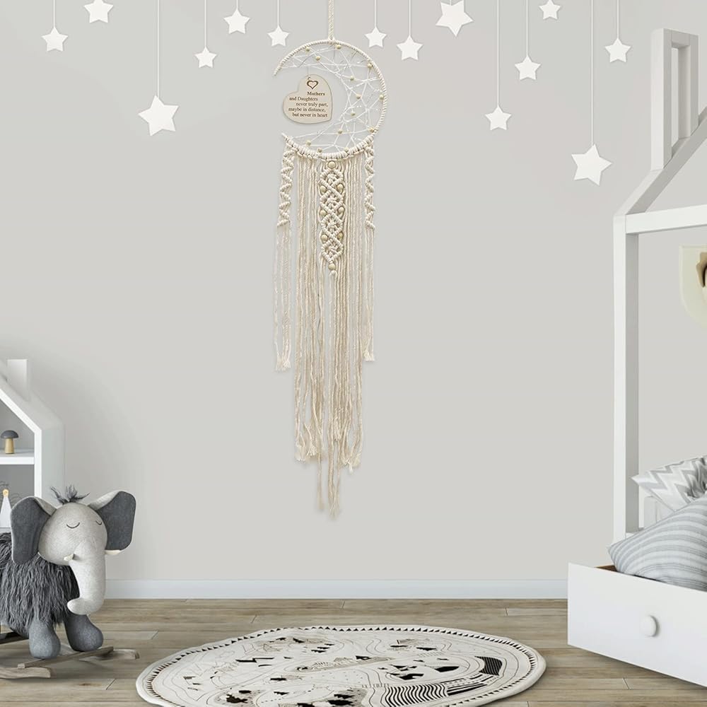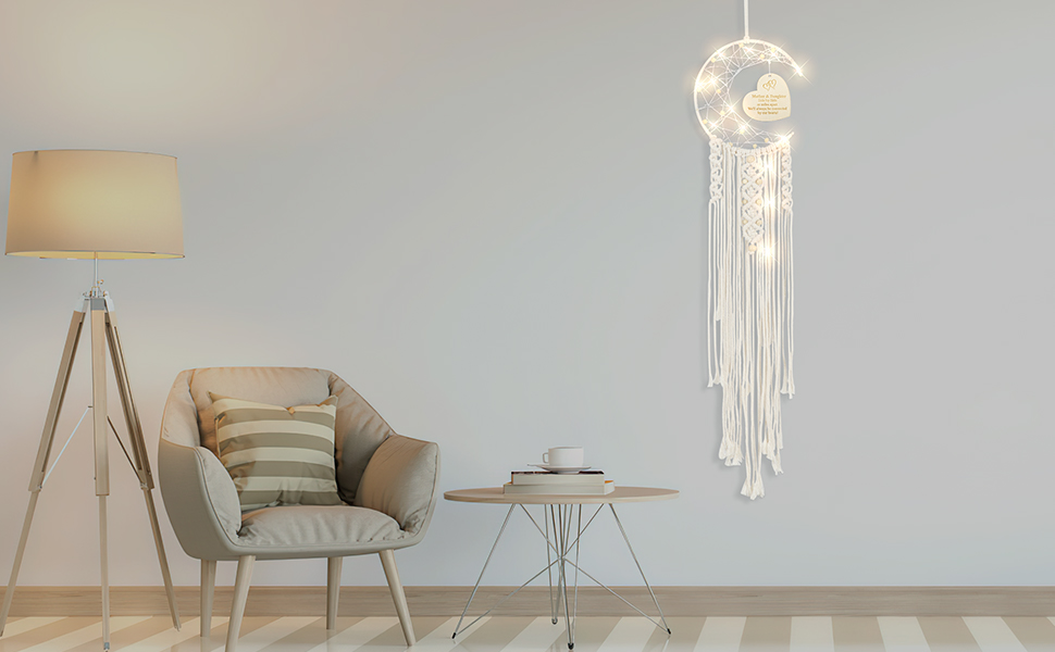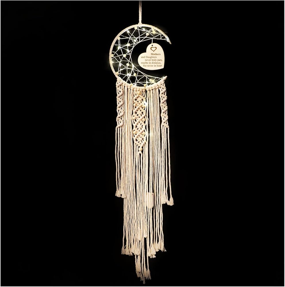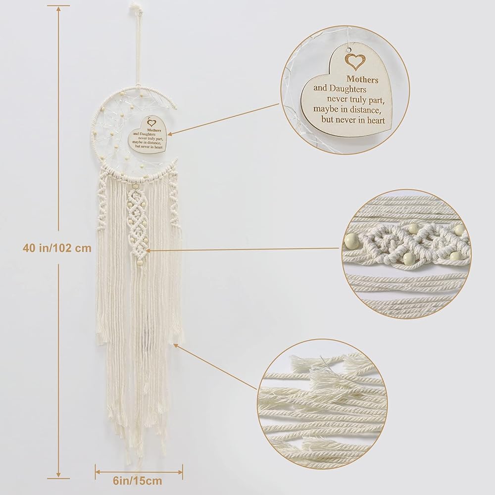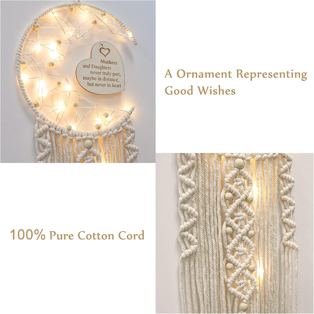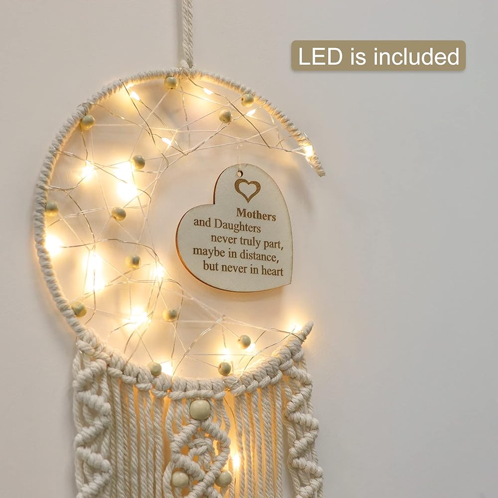 ديكور فني مبتكر: تتميز هدية صائدة الأحلام للأم بقمر نصف دائرة وتصميم لوح خشبي منحوت على شكل قلب مع ضوء LED ملفوف حولها. إنها هدية جميلة لإضافة اللون ولمسة مريحة إلى والدتك دون عناء. غرفة.