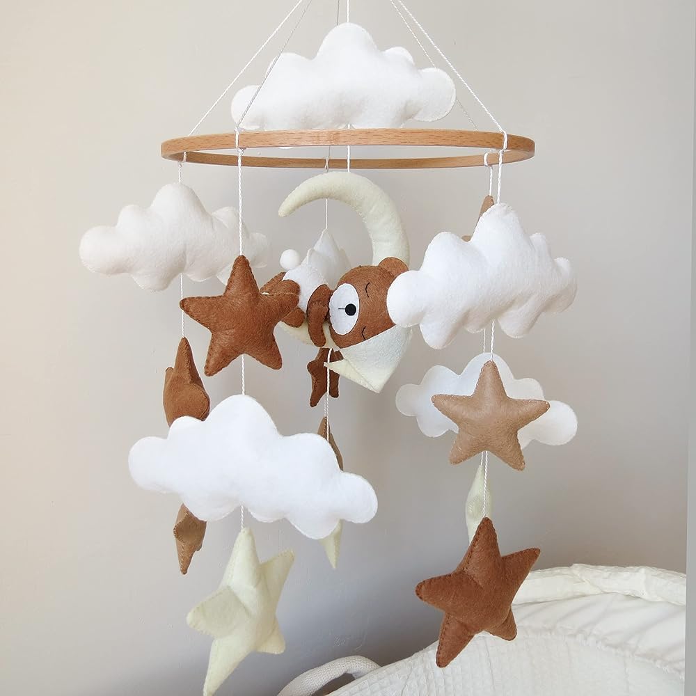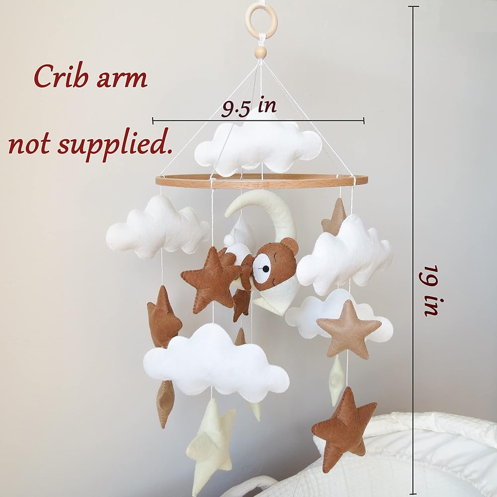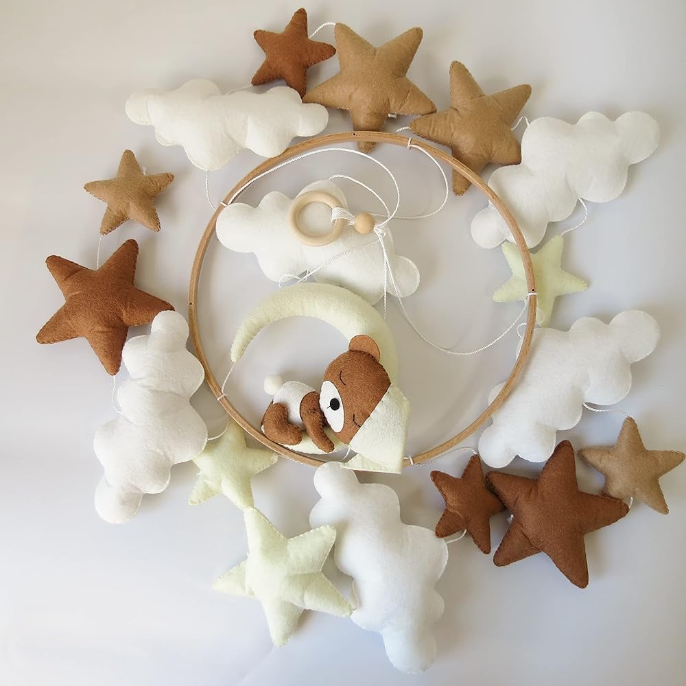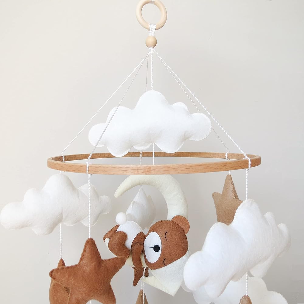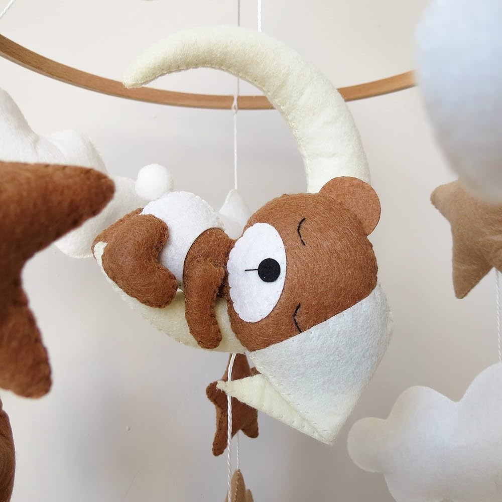 Goukurlsma Neutral Crib Mobile With Sleeping Bear Baby Mobile for Crib Handmade Felt Beige Mobile Nursery Decor Baby Crib Mobile for Boys Girls and an Array of Stars and Clouds.