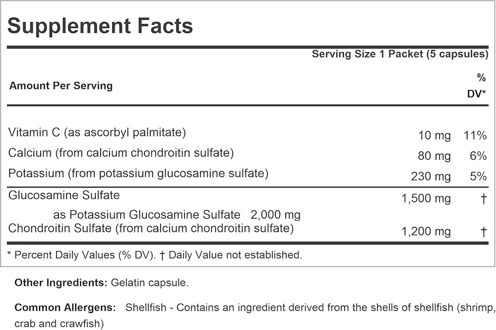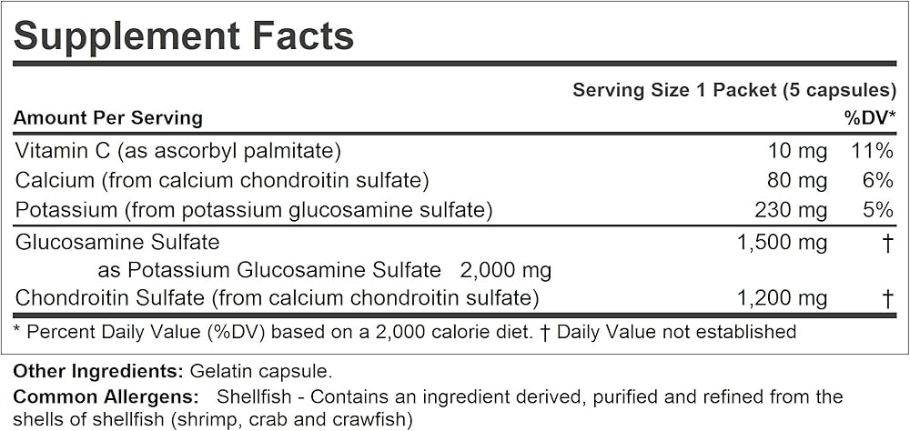 مكونات نشطة بيولوجيًا نقية 100% - توفر جميع التركيبات الخالية من الكبريتات والصوديوم والمواد المضافة، بما في ذلك 1500 مجم من كبريتات الجلوكوزامين و1200 مجم من كبريتات الكوندرويتين وفيتامين ج والكالسيوم والبوتاسيوم. لا يحتوي على حليب / خالي من منتجات الألبان، خالي من الغلوتين؛ لا يوجد فول الصويا أو الخميرة أو الذرة أو القمح أو الصوديوم أو الملح أو السكر أو الدهون أو الكوليسترول أو اللون أو المواد الحافظة أو إضافات التصنيع. يحتوي على مكون مشتق ومنقى ومكرر من قذائف المحار (الروبيان وسرطان البحر وجراد البحر).