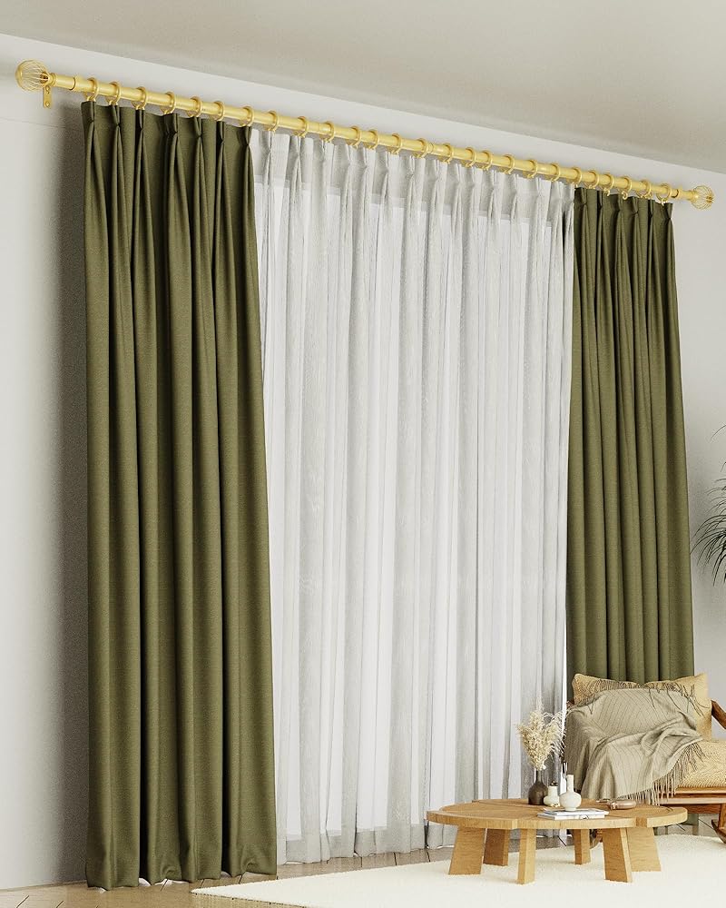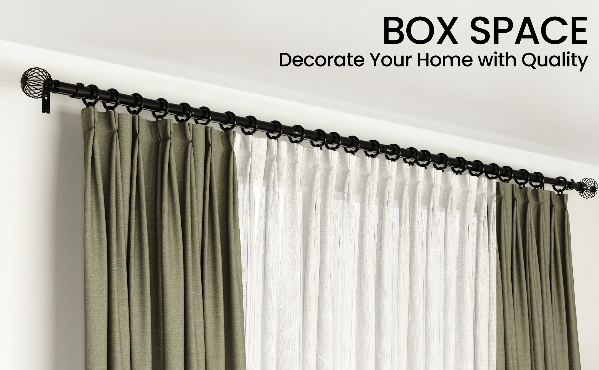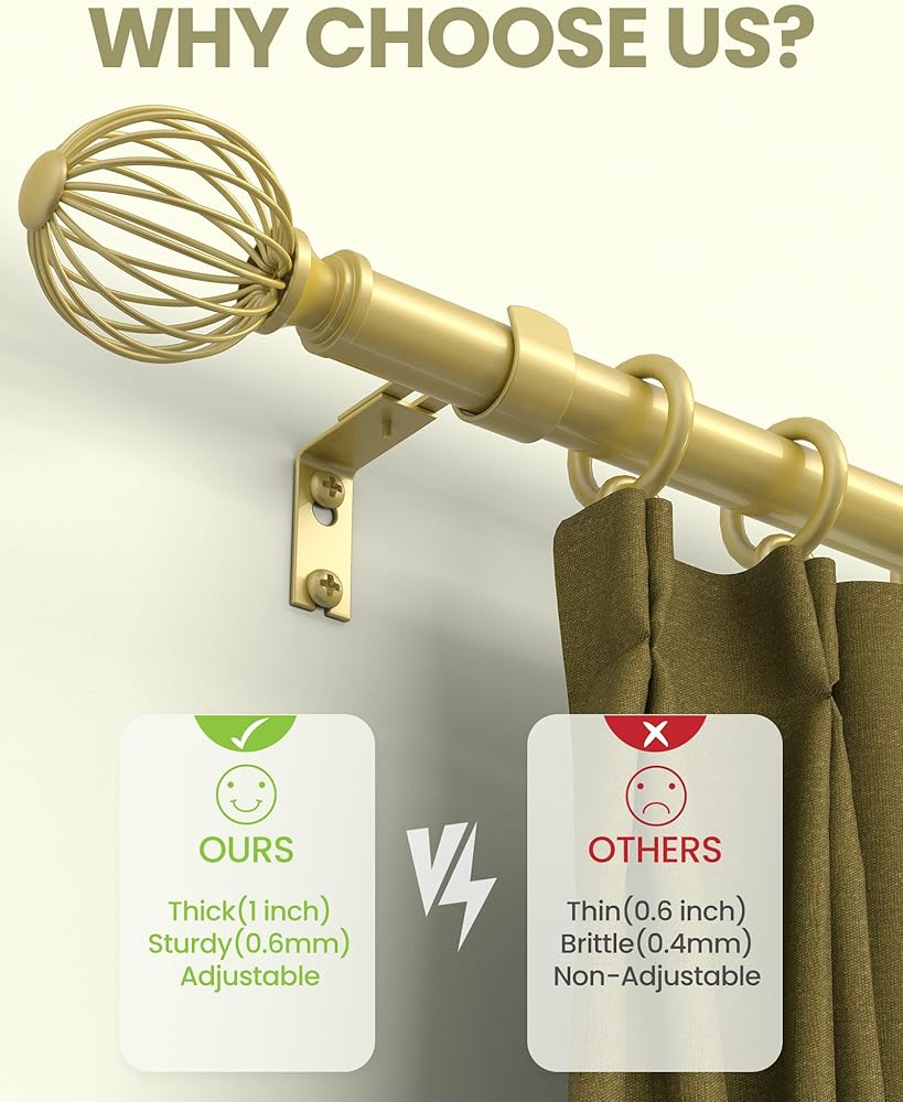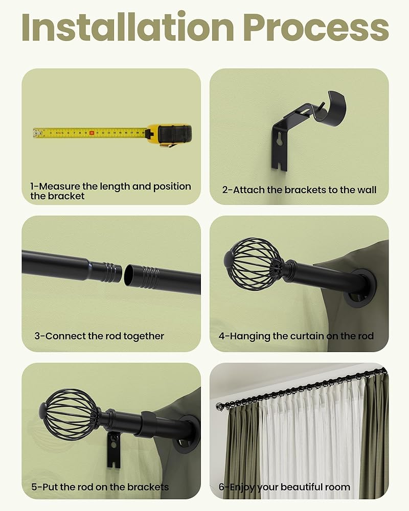 قوي ومستقر: قضيب الستارة مصنوع من مادة الفولاذ المقاوم للصدأ بقطر 1 بوصة وسمك 0.6 مم، والذي يتمتع بقدرة تحمل أكبر، ويمكن أن يدعم أقمشة الستائر الأثقل.