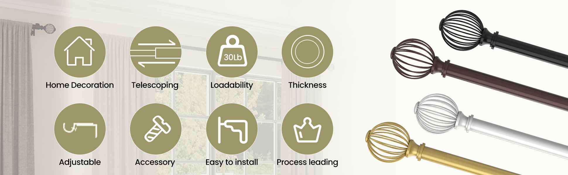 اللمسات النهائية لقضيب التصميم الحديث: توفر اللمسات النهائية لقضيب الستارة ذات النمط المعدني الفريد خيارًا فريدًا للديكور الداخلي. سواء تم استخدامها في غرفة ذات طراز حديث أو صناعي أو عتيق أو أي غرفة ذات طراز آخر، فإن هذه اللمسات تضيف سحرًا خاصًا إلى المساحة الإجمالية.