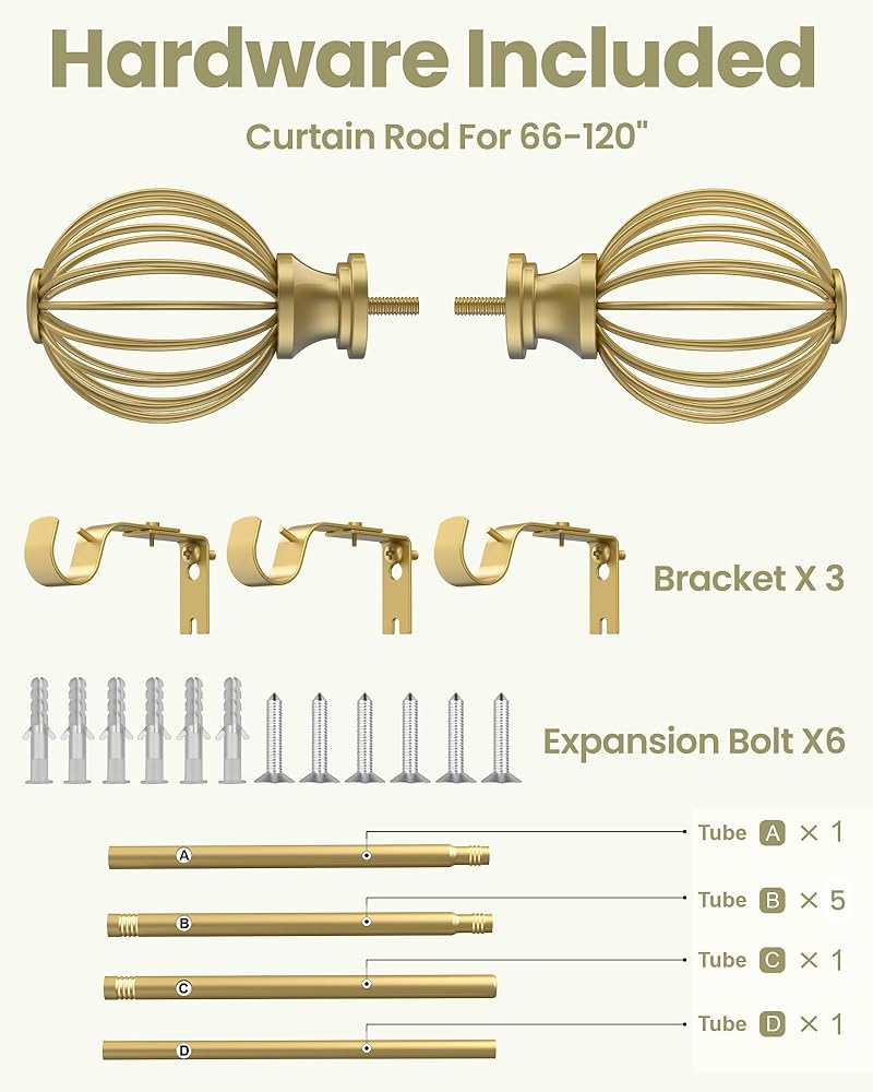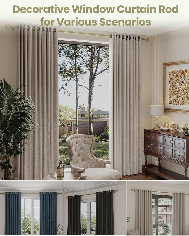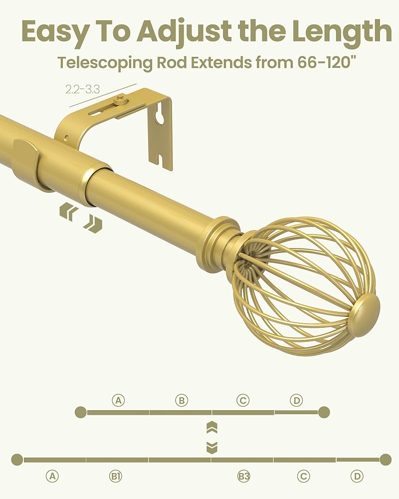 قضبان ستارة قابلة للتعديل: قضيب الستارة هذا قابل للتعديل من 66 إلى 120 بوصة. تتيح الراحة المتمثلة في القدرة على ضبط طول قضيب الستارة بسهولة للمستخدمين التكيف مع التغيرات الموسمية أو تفضيلات الديكور أو الاحتياجات الشخصية. (تأكد من أن نطاق الحجم هذا يناسب حجم نافذتك.)