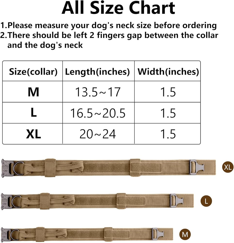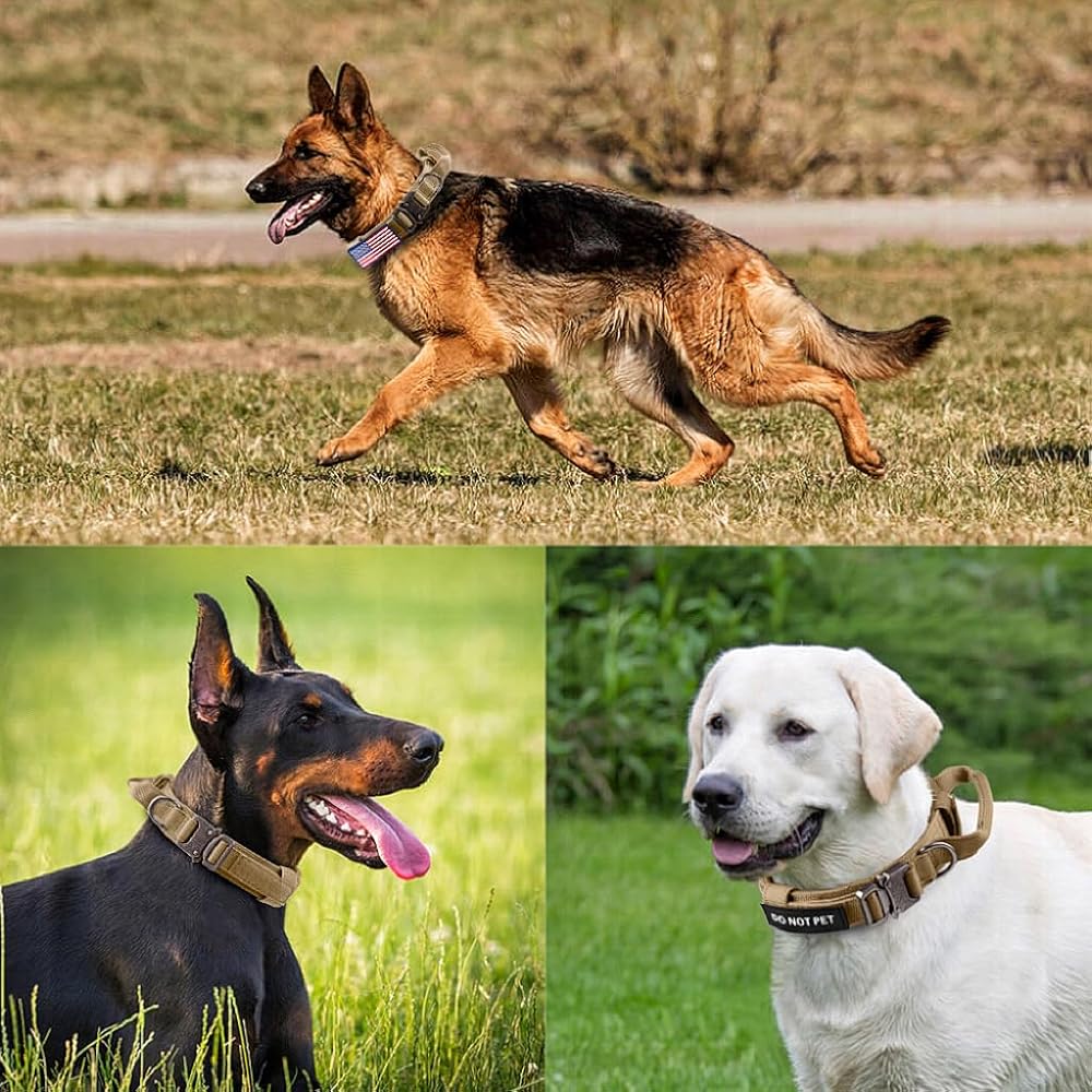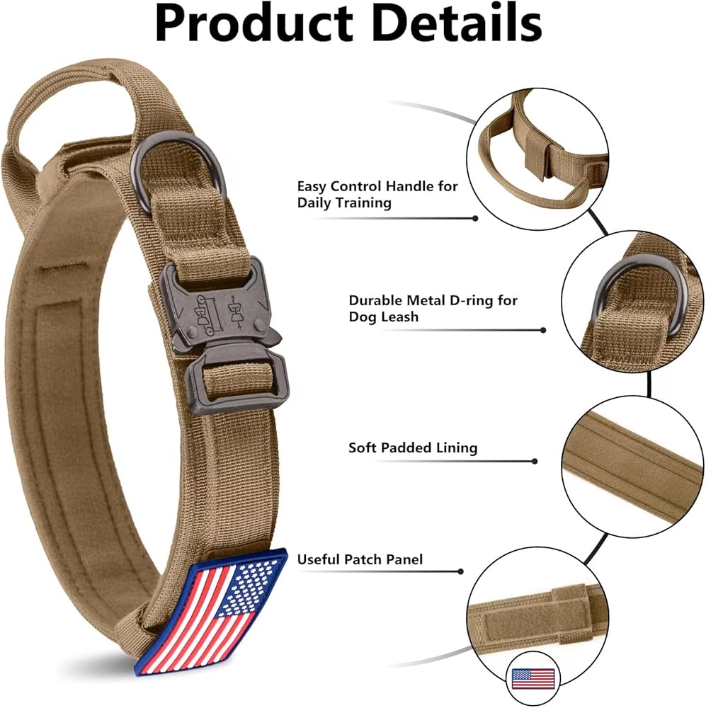 【مقبض تحكم خاص】يحتوي طوق الكلب العسكري على مقبض تحكم خاص، ويمكن أن يساعدك على التحكم في كلبك جيدًا عند التدريب والدوريات والمشي لمسافات طويلة والجري والصيد والتخييم والمشي. إنها مناسبة للكلاب المتوسطة والكبيرة، مثل: الراعي الألماني، لابرادور، جولدن ريتريفر، بوردر كولي، روتويللر، دوبيرمان، هاسكي، ألاسكا مالاموت، جريت داين، إلخ.