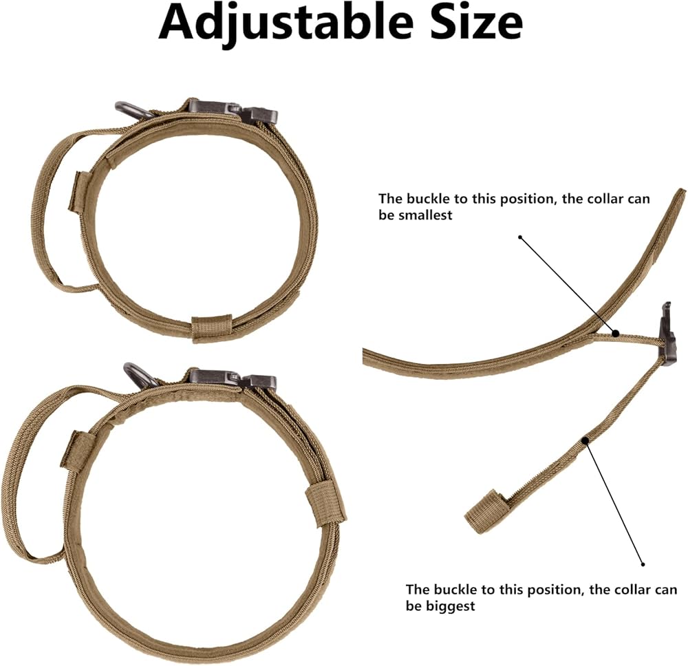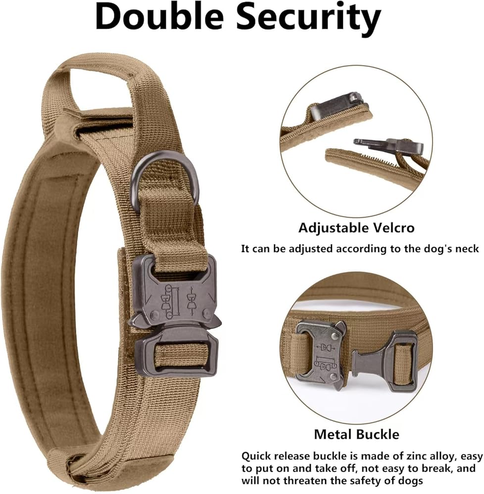 【تصميم أمان مزدوج】يعتمد طوق الكلب التدريبي العسكري السميك على تصميم زر طوق متكامل، سهل الارتداء والخلع، ويمكن تحرير المشبك المعدني بسرعة في حالة الطوارئ. يوفر الملصق السحري والإبزيم المعدني الموجود على طوق الكلب القابل للتعديل أمانًا مضاعفًا للكلب، وليس من السهل أن يسقط.