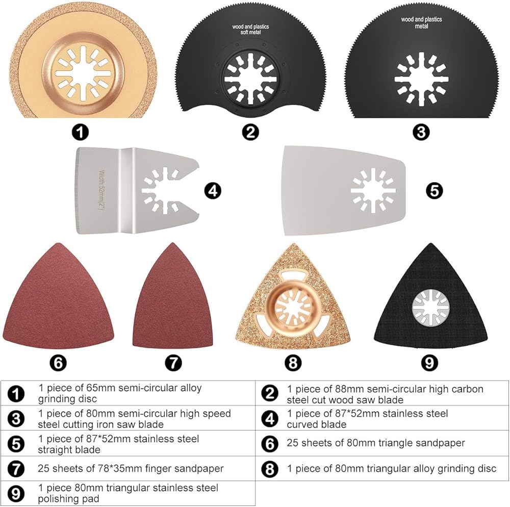 • 【66-Piece Oscillating Accessory Kit】This set has 66 parts, including 16 different specifications of saw blades, suitable for many cutting jobs, helping you efficiently complete a variety of different work. This kit will be your right-hand man.