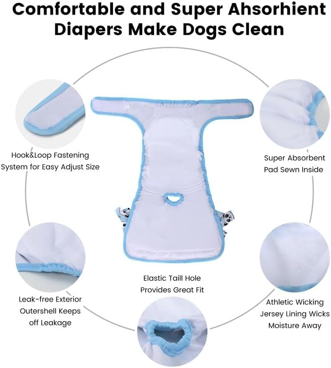 【فائقة الامتصاص】الطبقة الداخلية متعددة الطبقات عالية الامتصاص والطبقة الخارجية مقاومة للماء لمنع التسرب وتلف السجاد والكراسي والأرائك المنجدة. مناسبة للجراء غير المدربين، وحفاضات الكلاب الأنثوية لدورة الحرارة والكلاب التي تعاني من التبول أو سلس البول.