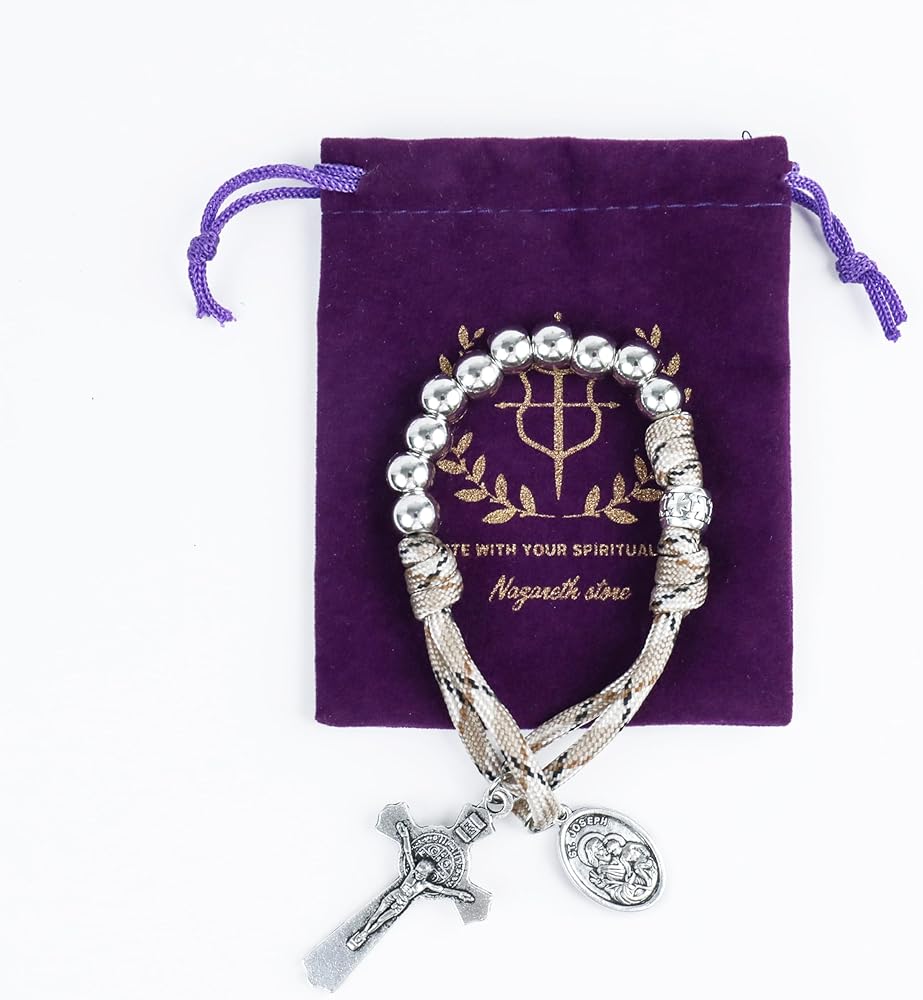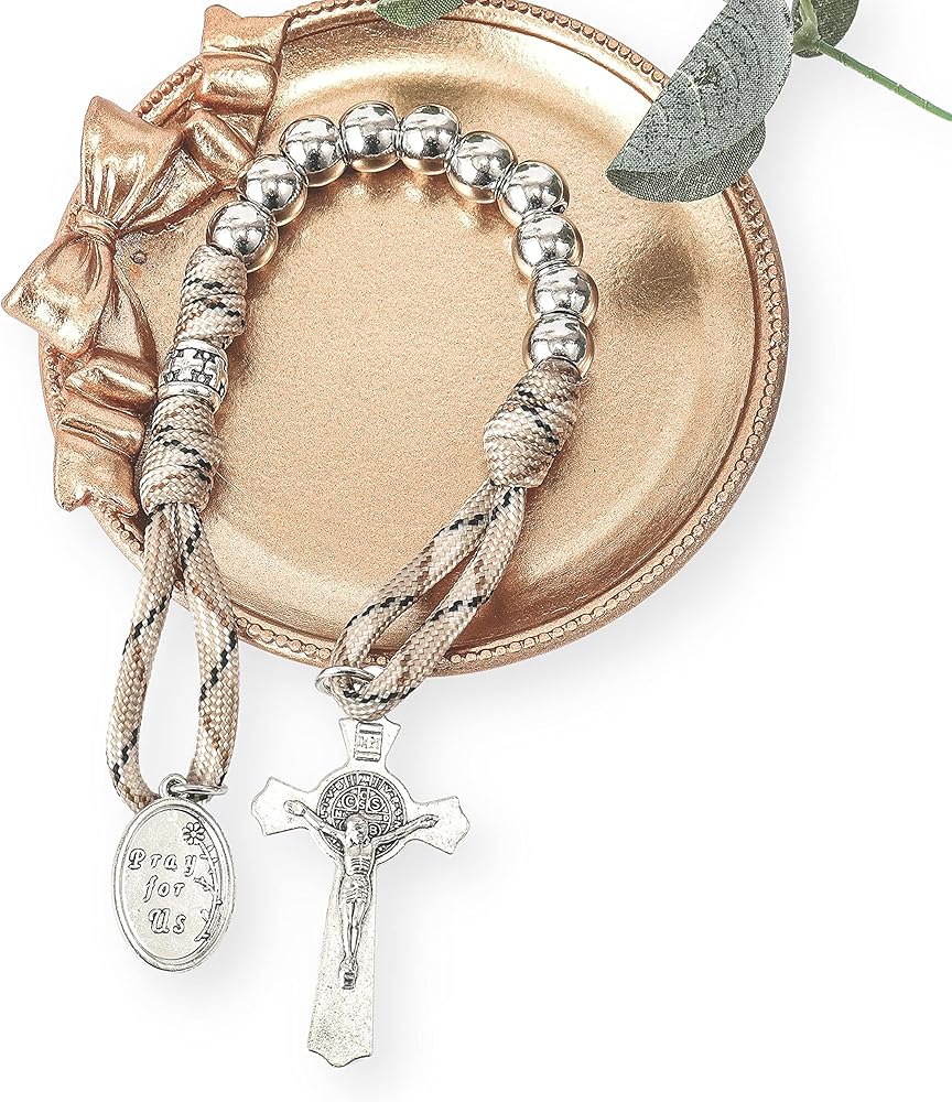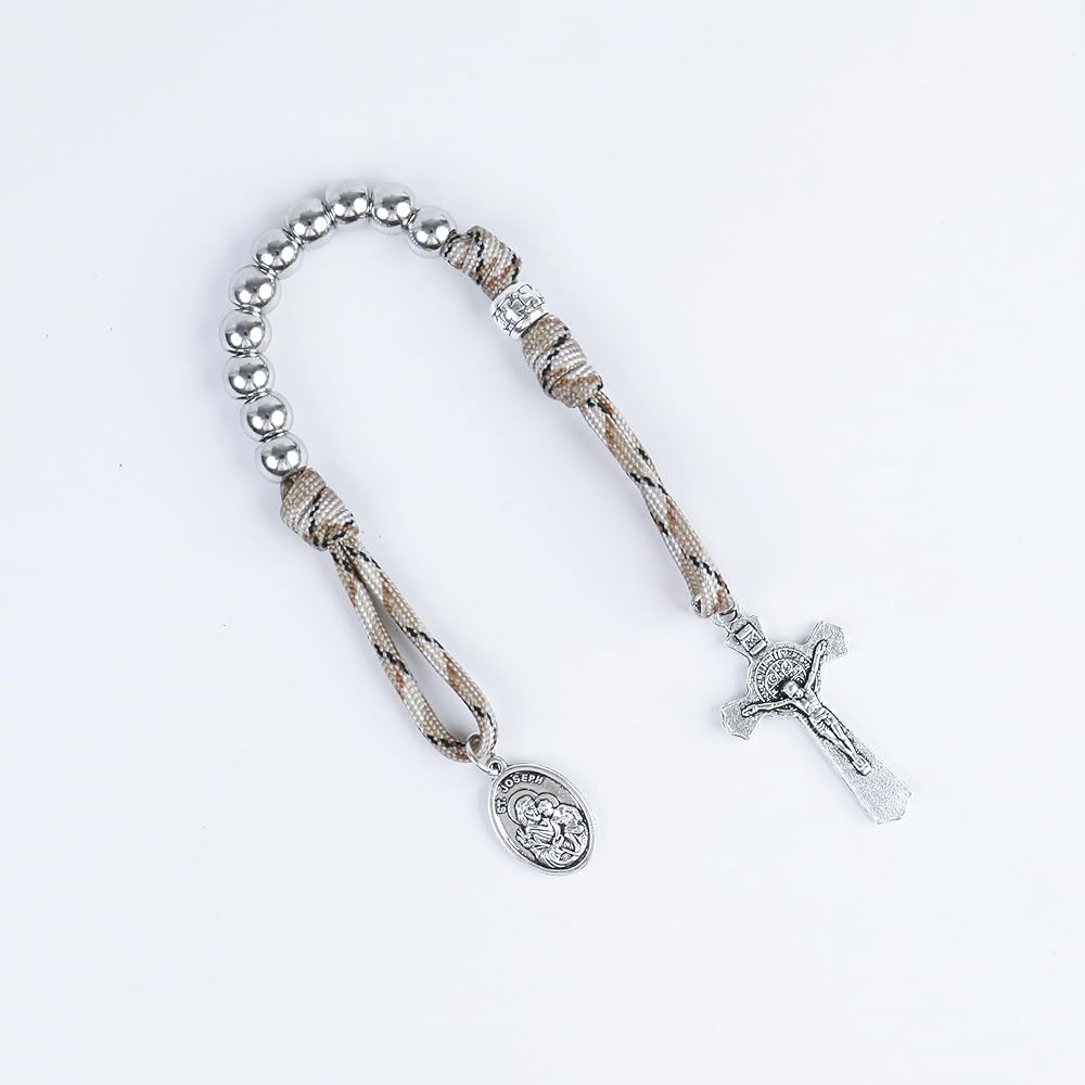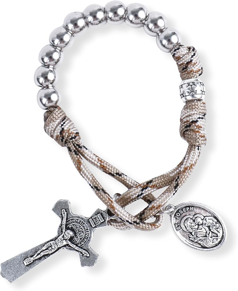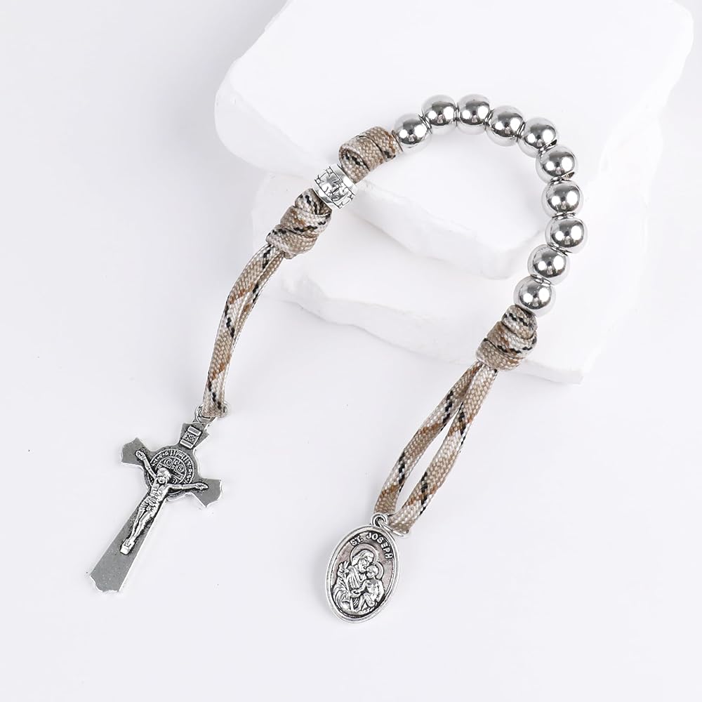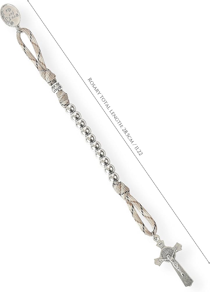 سبحة باراكورد قوية ومتينة لعقد واحد، خرز من الستانلس ستيل بلون فضي 10.00 ملم معقود بحبل كاكي أخضر قوي للغاية، جنبًا إلى جنب مع معدن 1.6 انش سانت بنديكت كروس والقديس يوسف يصلي من أجلنا، مصنوعة من خليط الزنك المطلي بالفضة الثور، مما يمنع التآكل ويضمن المتانة لسنوات.