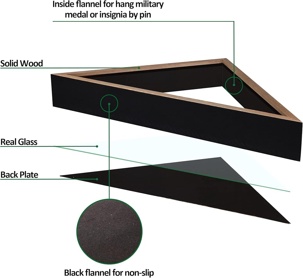 يمكن أن يعرض إطار صندوق ظل العلم هذا علم دفن أمريكي المخضرم، كما يمكن أن يعلق ميدالية عسكرية أو شارة بالدبوس، بسبب أننا لصق فانيلا سوداء على تجويف داخلي.