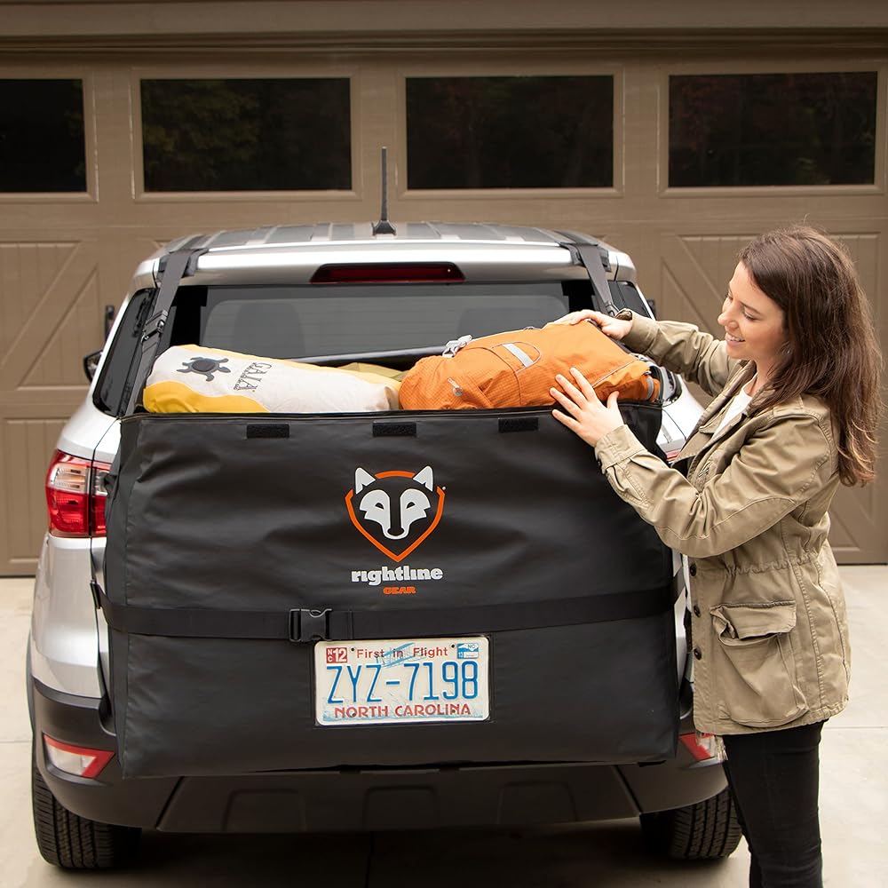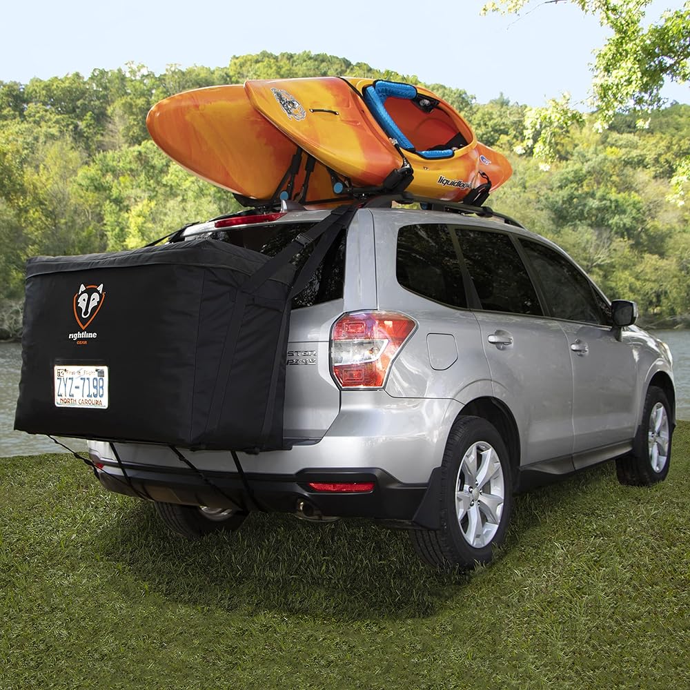 The Car Back Carrier's patented design is the perfect solution for those who transport their paddle sports, snow sports, or cycling equipment on SUVs, minivans, and crossovers. Our innovative weatherproof storage containers allow you to keep your gear on the roof - and cargo on the back - so you can transport your belongings and your passengers without compromising on safety, comfort, or convenience. Gear up with confidence; our camping storage containers feature easy rear access and Grab-N-Go handles that allow you to easily carry your bag inside once you've reached your destination! The Rightline Gear Car Back Carrier attaches to vehicles WITH or WITHOUT a roof rack!