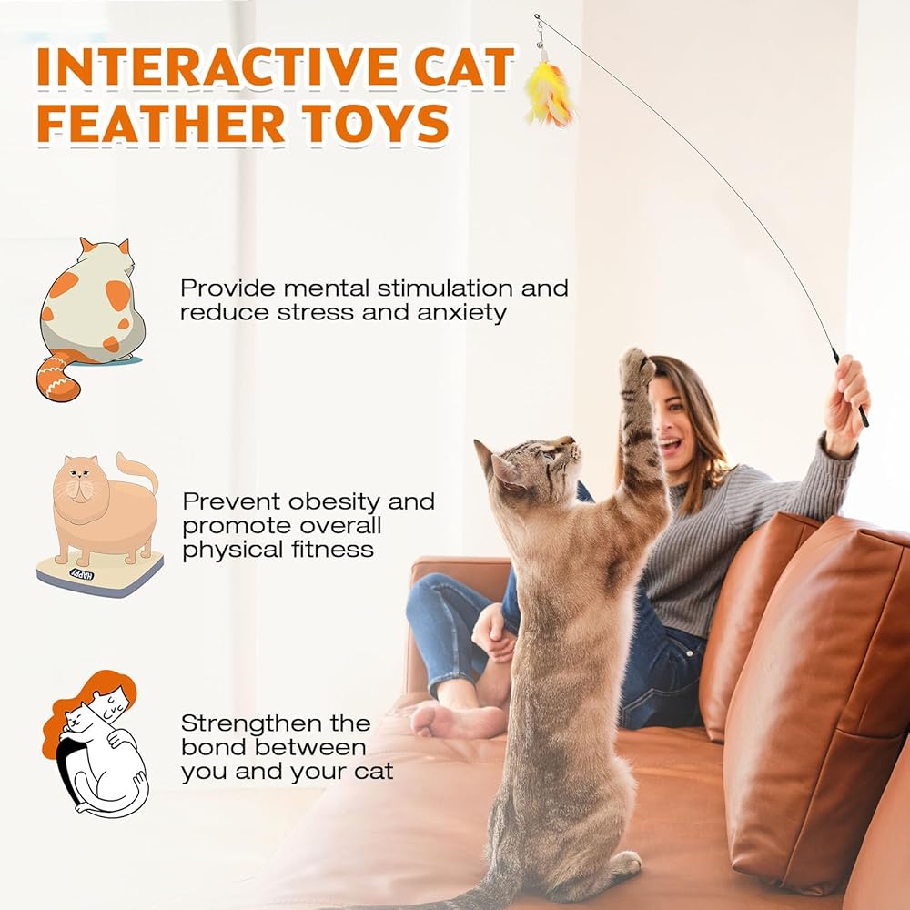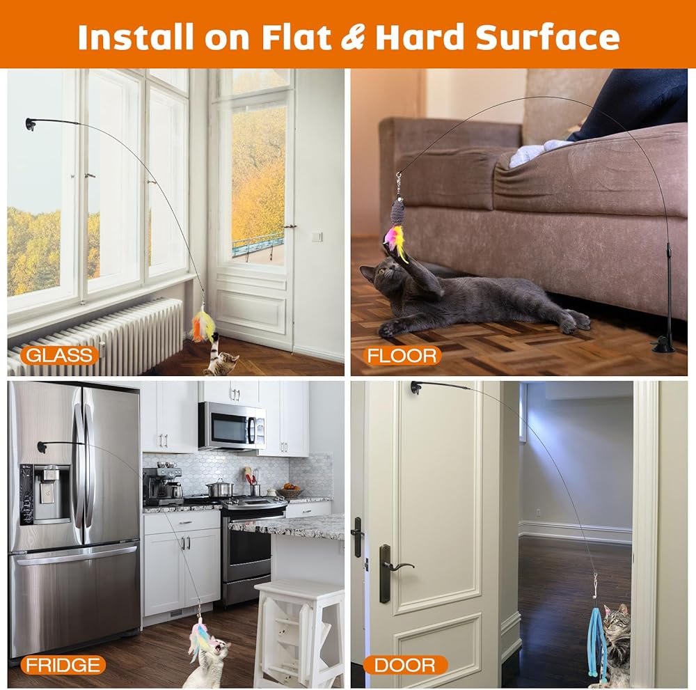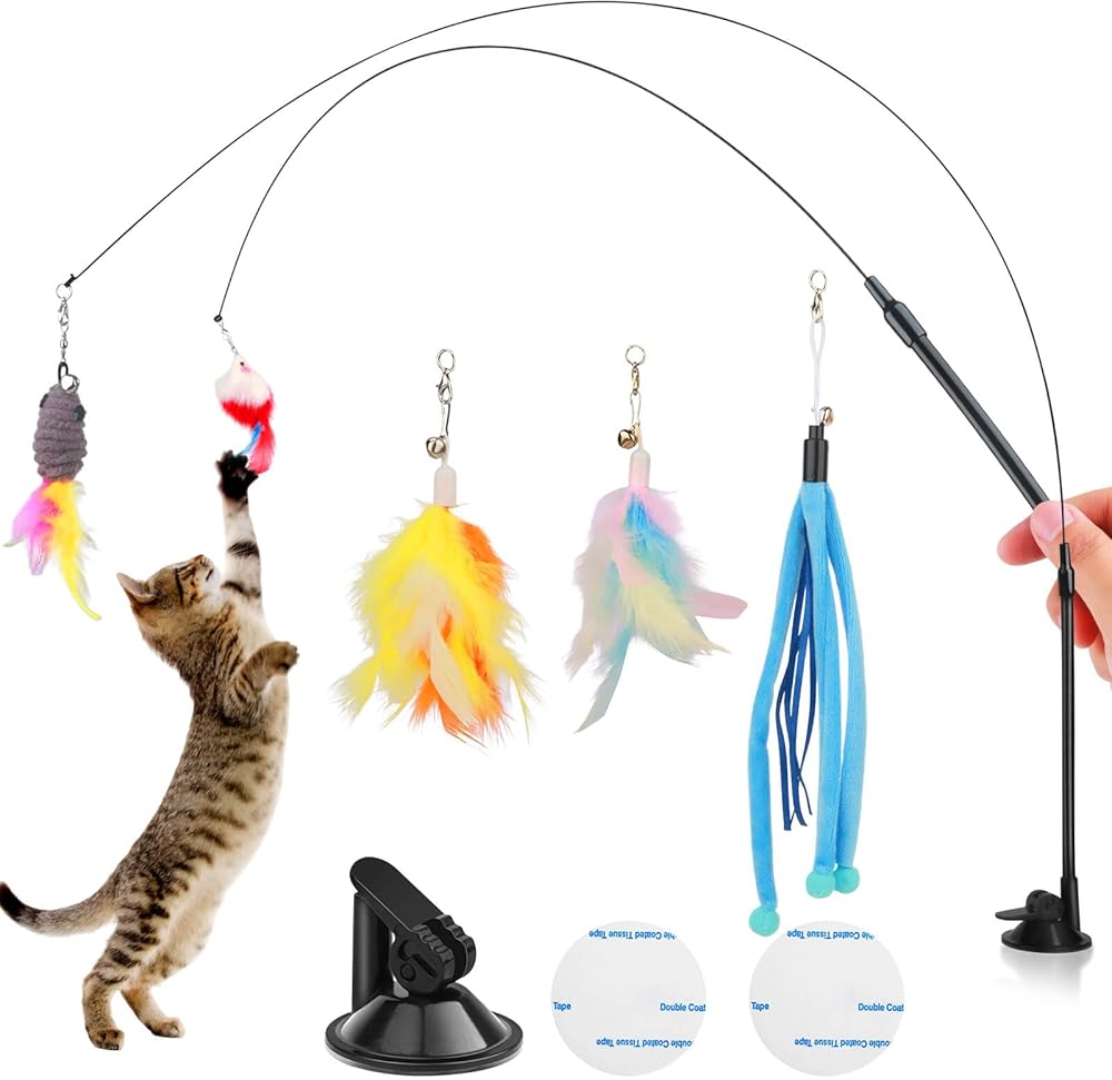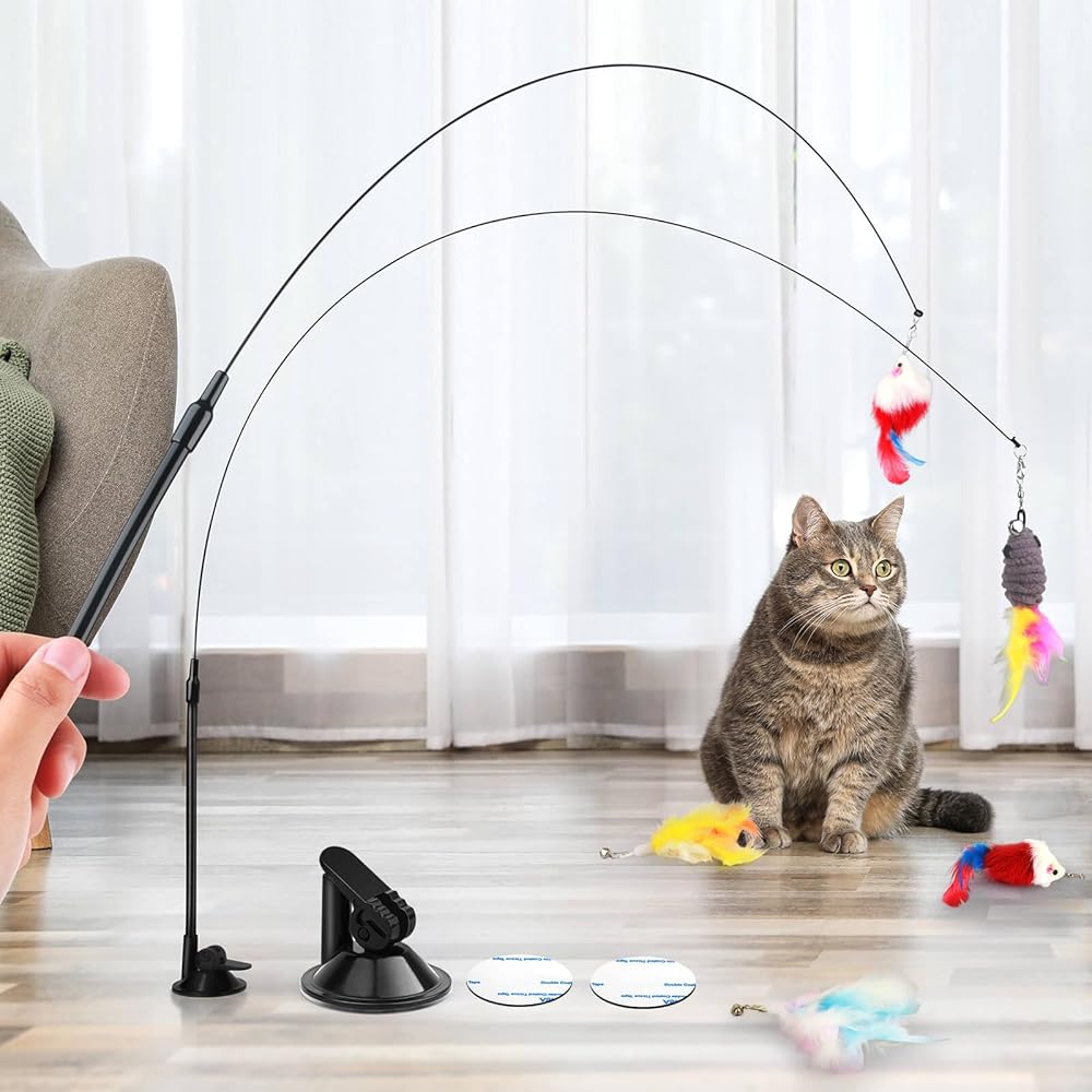 • محتويات العبوة - تحتوي العبوة على 2 عصا قطط، 2 كوب شفط، 2 شريط مزدوج الجوانب و5 ألعاب بديلة. استبدل اللعبة الموجودة على العصا، مما يوفر للقطة تجربة جديدة ومثيرة في كل مرة تلعب فيها باللعبة. اختيار هدية رائع لآباء القطط.