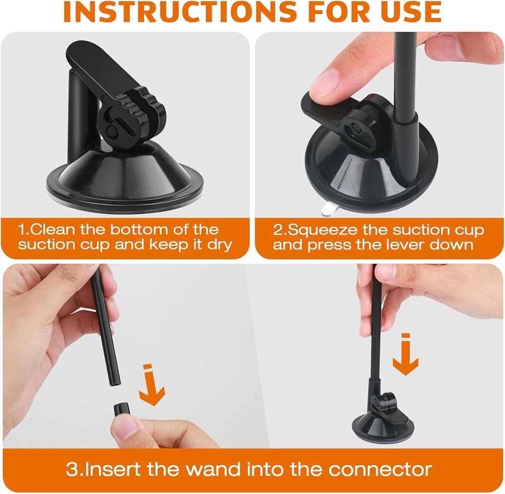 • نصائح الاستخدام - يرجى التأكد من أن الجزء السفلي من كوب الشفط نظيف وجاف؛ اضغط على القاعدة من الأعلى إلى الأسفل لطرد الهواء قبل الضغط على الرافعة؛ قلل الحركة بعد تثبيت كوب الشفط؛ إذا لم يعمل كوب الشفط، فكر في استخدام الملصقات ذات الوجهين.