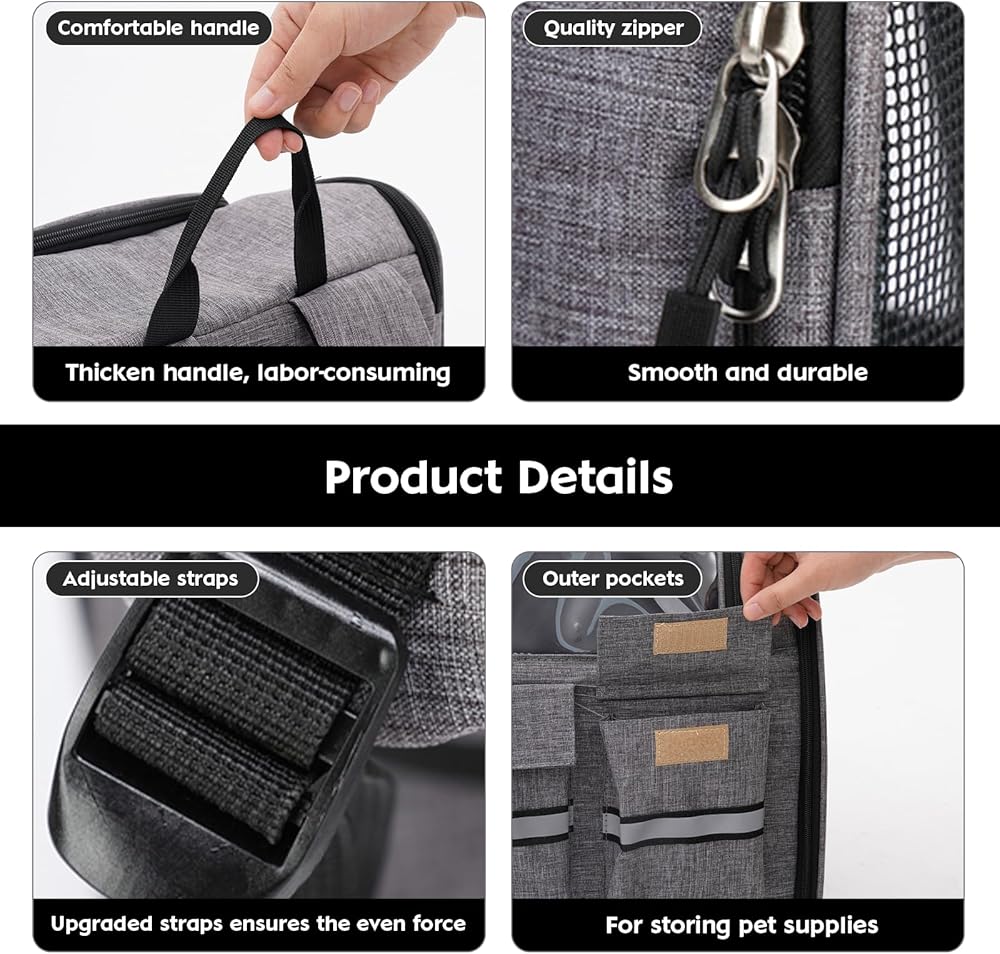 3 طرق مختلفة للحمل: يوفر المقبض المتداخل ومقبض الحزام وأحزمة الظهر 3 حلول حمل سهلة ومريحة لتلبية الاحتياجات اليومية المختلفة. مساحة تخزين كبيرة - جيبان كبيران في الجزء الأمامي من الحقيبة مثاليان لتخزين الأشياء التي لا يمكن لحيوانك الأليف أن يخرج منها أبدًا، كما يوجد جيب عاكس للضوء بشكل منفصل، مما يضمن أن الحقيبة مرئية ويمكن التعرف عليها في الليل.