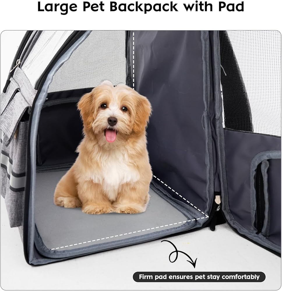 حامل كلاب بتصميم مريح: أحزمة الكتف مجهزة ببطانة سميكة إضافية لمزيد من الراحة وتقليل الضغط على الكتفين. الجزء الخلفي من حقيبة الظهر سميك للغاية لمنع الوسادة السفلية من الاصطدام بظهرك عندما تحمل حيوانك الأليف. كما أنها تأتي مع بساط قابل للإزالة لإضافة المزيد من الراحة لحيوانك الأليف في الحقيبة.