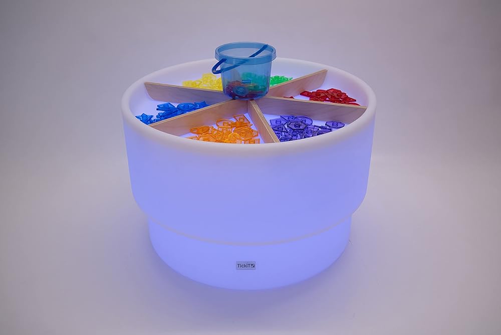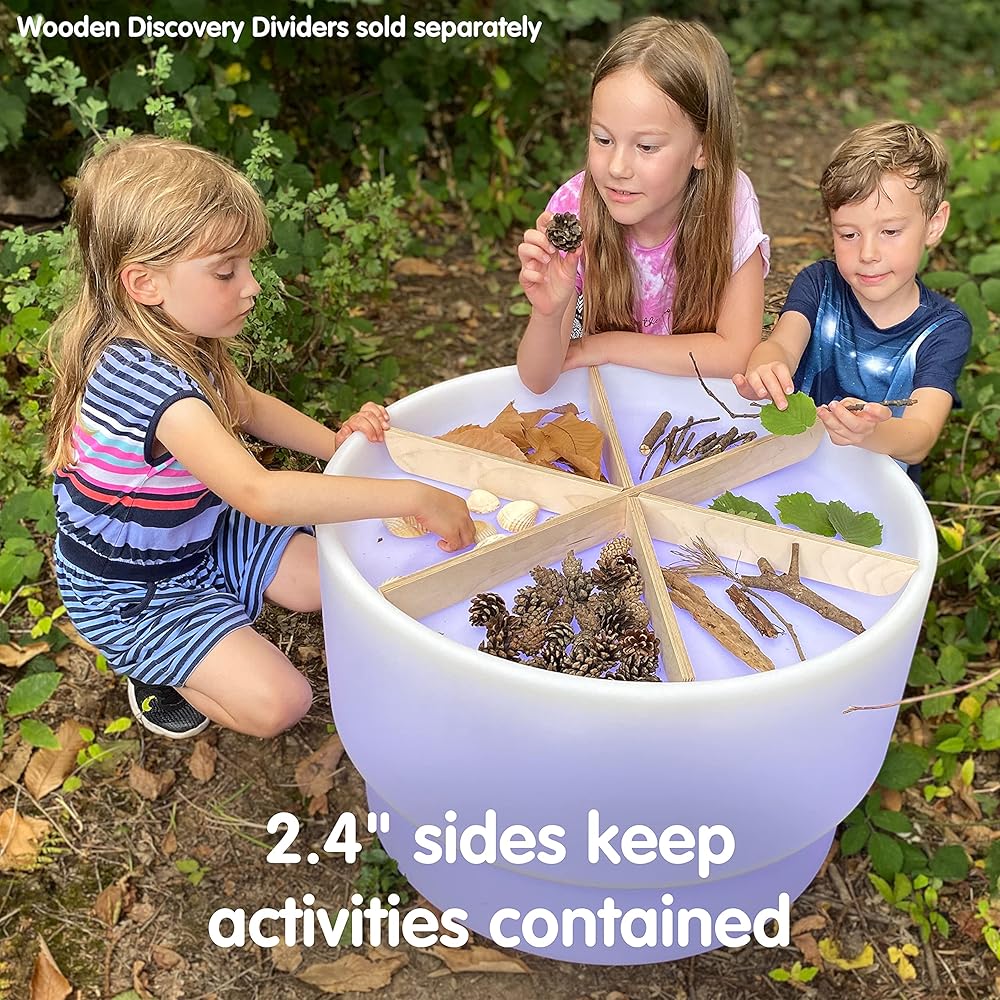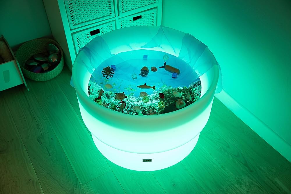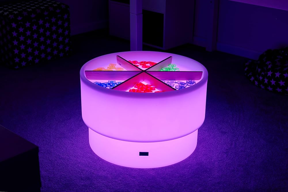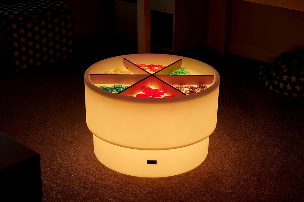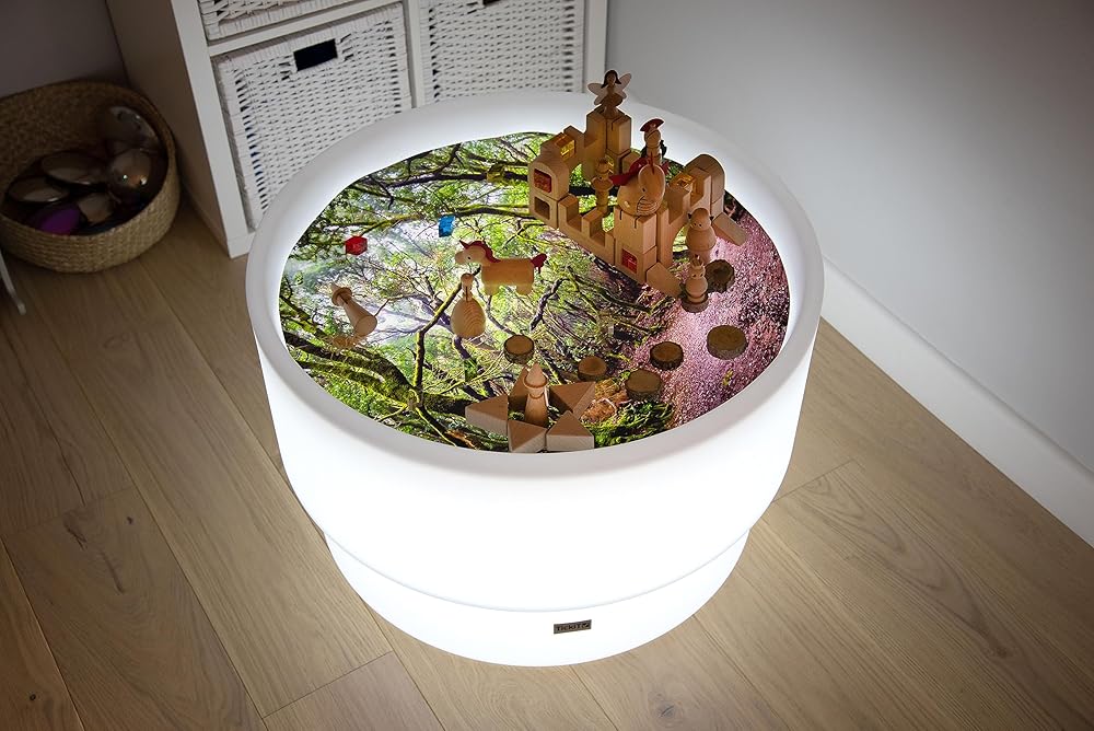 التصميم القوي وخفيف الوزن جميل وعملي: سهل النقل بين المواقع، سريع التنظيف ومثالي للعمل بالتركيز الفردي أو اللعب التعاوني. توفر إضاءة ملونة أو بيضاء ناعمة يتم تعديلها باستخدام جهاز التحكم عن بعد، ويمكن استخدام منطقة الاكتشاف لفرز الأشياء وترتيبها، واستكشاف المواد والمواد المختلفة (السائل، والرمل، والهلام، والإسفنج) مما يجعلها قاعدة مثالية لأنشطة اللعب الخيالية في العالم الصغير.