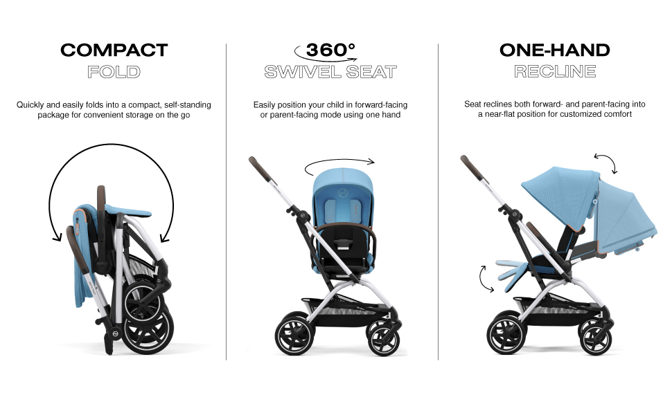 THE STROLLER WITH 360 DEGREE VIEWS: Designed to keep up with moms and dads on the go, this travel stroller offers a smooth ride and no need to move the seat on or off—just use one hand to turn the 360° swivel seat to forward-facing or parent-facing mode