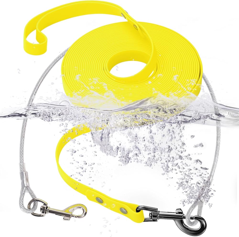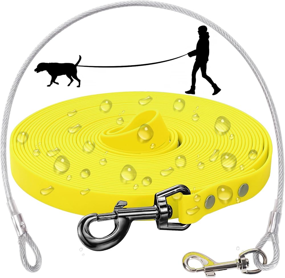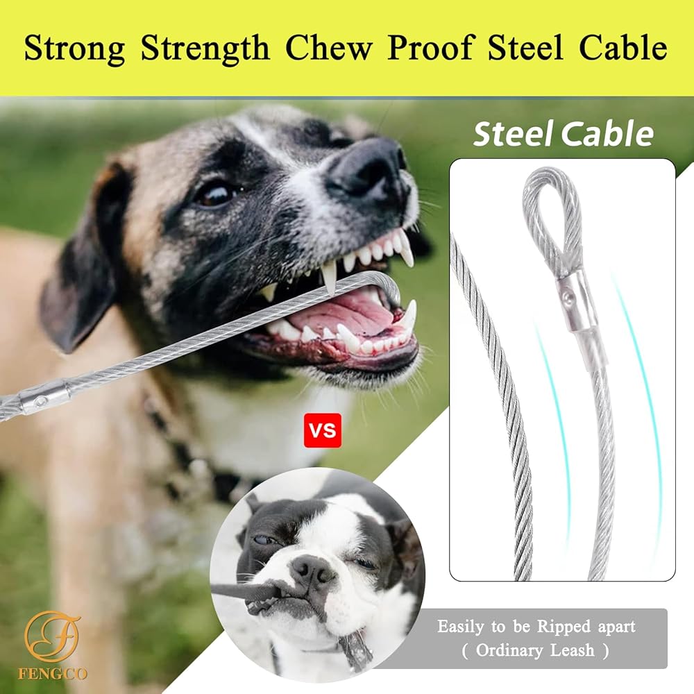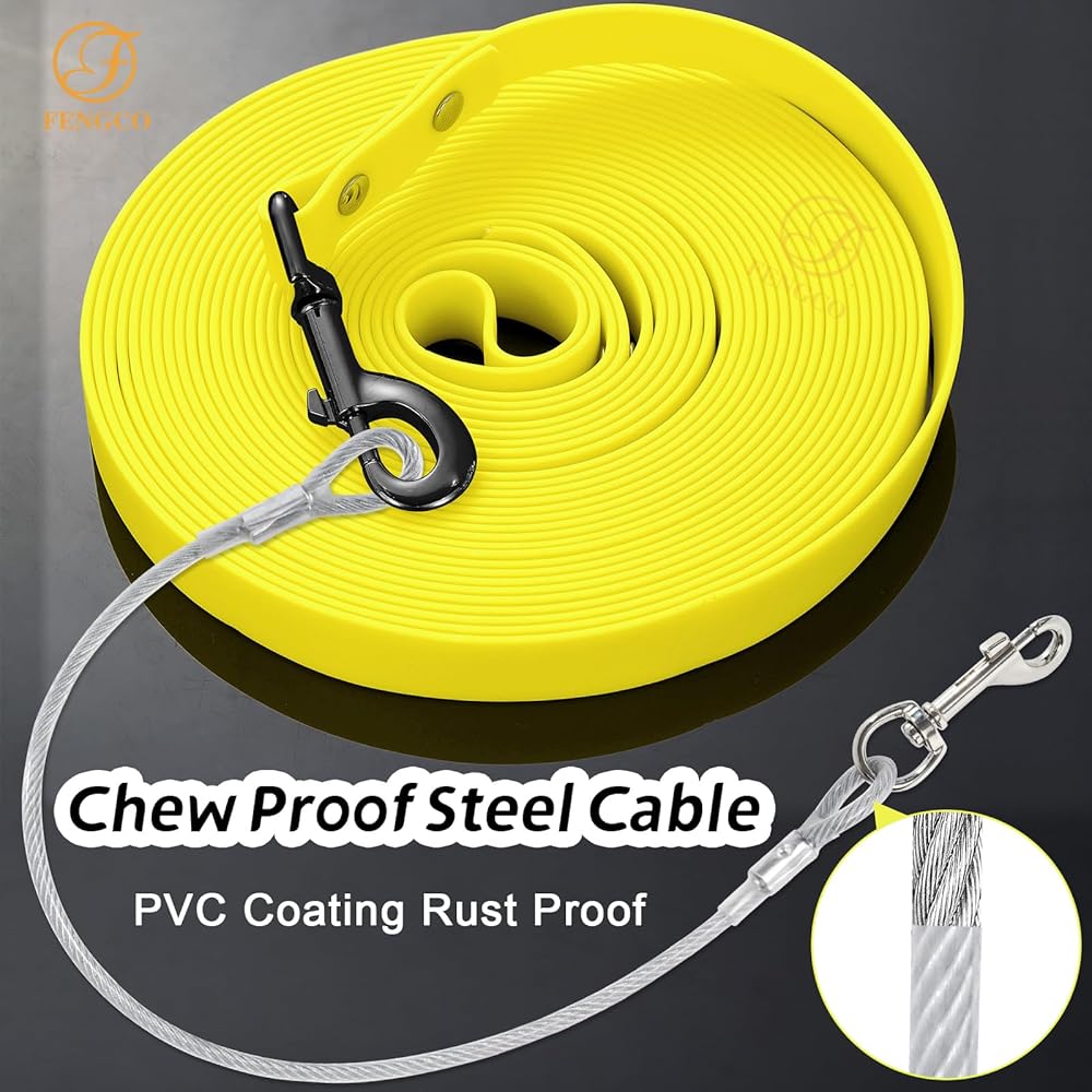 【Chew Proof】: Long Trainning Pvc dog leash with 1 heavy duty wire ropes which are chew proof, and the length of wire rope is 65cm(25inches), and the long pvc dog leash it not chew proof.
