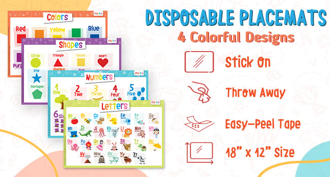 مقاس كبير: يبلغ مقاسها 17 انش عرضًا × 11 انش طولاً، توفر هذه السجادات الأربعة القابلة للغسل مساحة كبيرة للنشاط. ستحمي سطح طاولتك ومفرش طاولتك من انسكاب الطعام وبقع الطلاء
