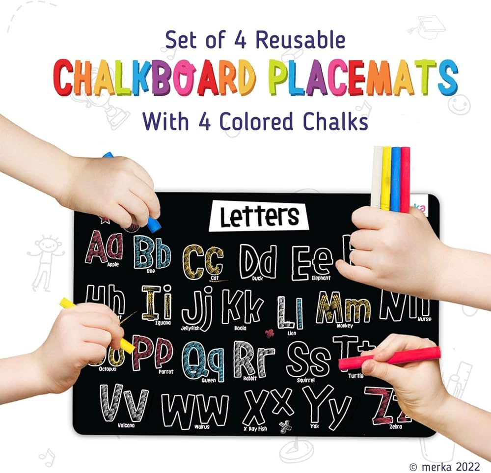 متعة تعليمية للأطفال: صممها المعلمون، توفر المفارش ميركا ساعات من الترفيه الإبداعي للأطفال على الطاولة. أي طفل يحب الرسم أو الرسم سيقضي وقتًا رائعًا في التلوين على سجادات السبورة هذه