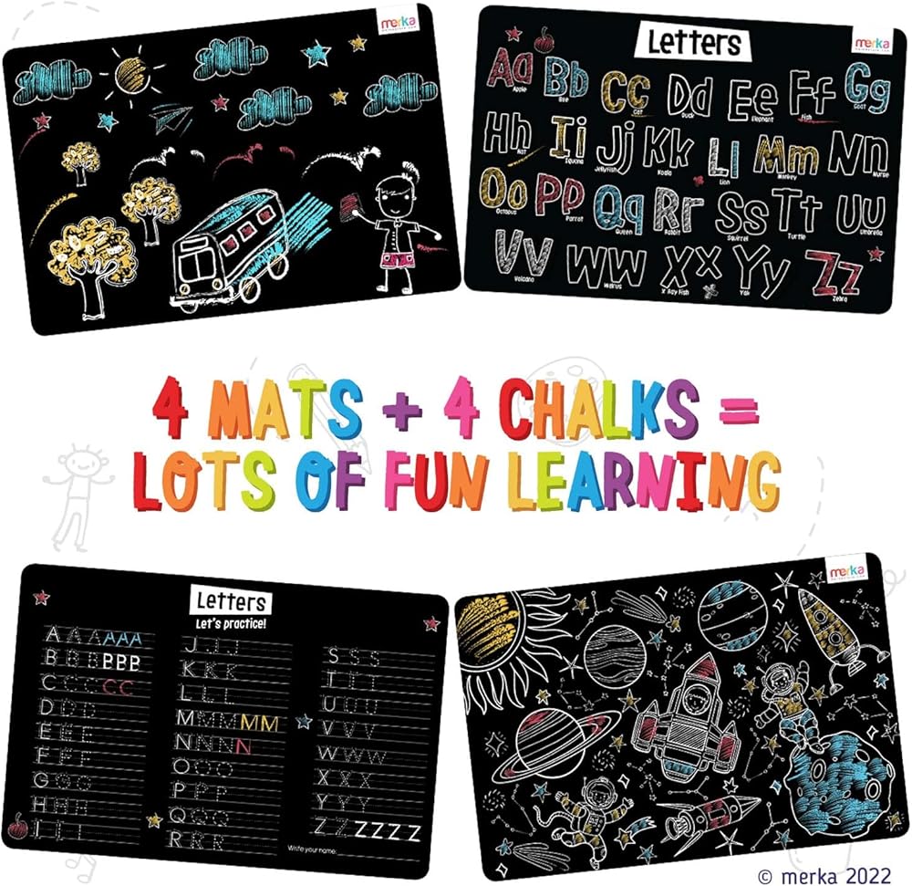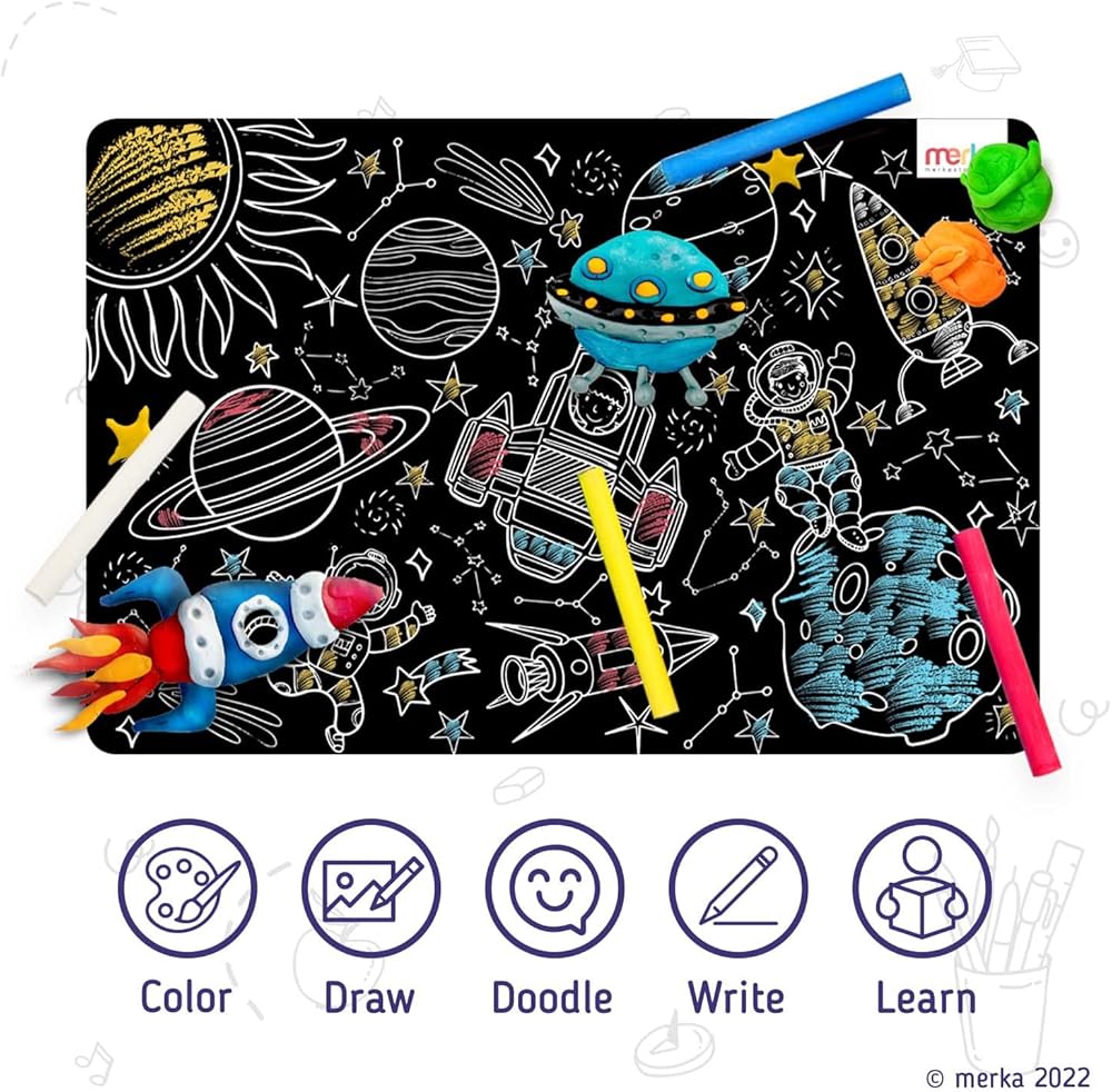 ميركا مفارش تلوين سبورة للاطفال - مجموعة من 4 مفارش قابلة للغسل واعادة الاستخدام مع 4 طباشير ملونة - انشطة تعليمية للاطفال - تتميز بسفن الفضاء ورواد الفضاء والحروف الابجدية