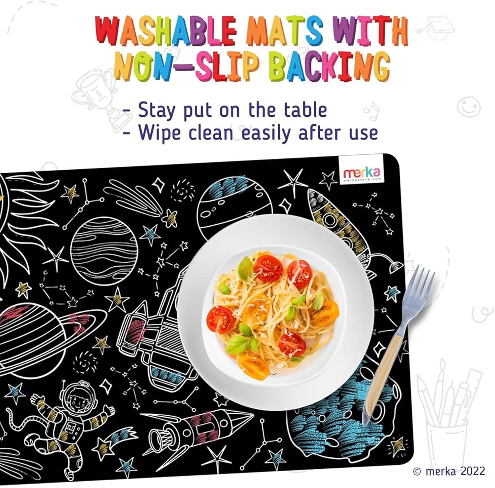 امنح أطفالك نشاطًا إبداعيًا سيحبونه واجعل الحياة أسهل على نفسك، كل ذلك في نفس الوقت. صُممت مفارش السبورة ميركا من قبل المعلمين، مما يجعل وقت تناول الطعام ممتعًا للأطفال، كما أنها سهلة التنظيف للغاية. تتميز هذه المجموعة المكونة من 4 سجادات بسفن فضاء ورواد فضاء وحروف أبجدية. تأتي مع مجموعة من 4 طباشير ملونة. يبلغ قياس مفارش الأطباق من ميركا 17 انش عرضًا × 11 انش طولاً، وهي متينة وتدوم طويلاً. يلتصق الجزء الخلفي بالشفط غير القابل للانزلاق بسهولة على طاولتك الفنية أو طاولة العشاء الخاصة بك، وبعد الاستخدام، يمكنك ببساطة غسل السجادة لتنظيفها بالماء والصابون. جميع المفارش البلاستيكية المصنوعة من السيليكون من ميركا خالية من BPA، مما يعني أنها آمنة وصحية بنسبة 100% للرضع والأطفال والكبار.